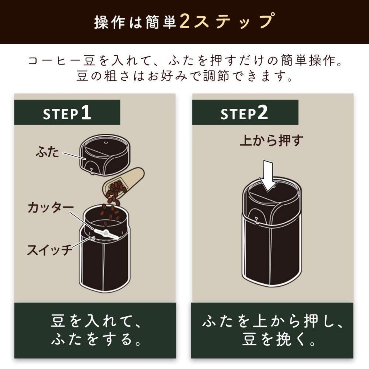 【簡単操作】①豆を入れて蓋をします。②蓋を上から押し、豆を挽くと完成です【注意】※45秒以上連続して運転しないこと。続けて運転する際は、2分以上おいてから運転すること。