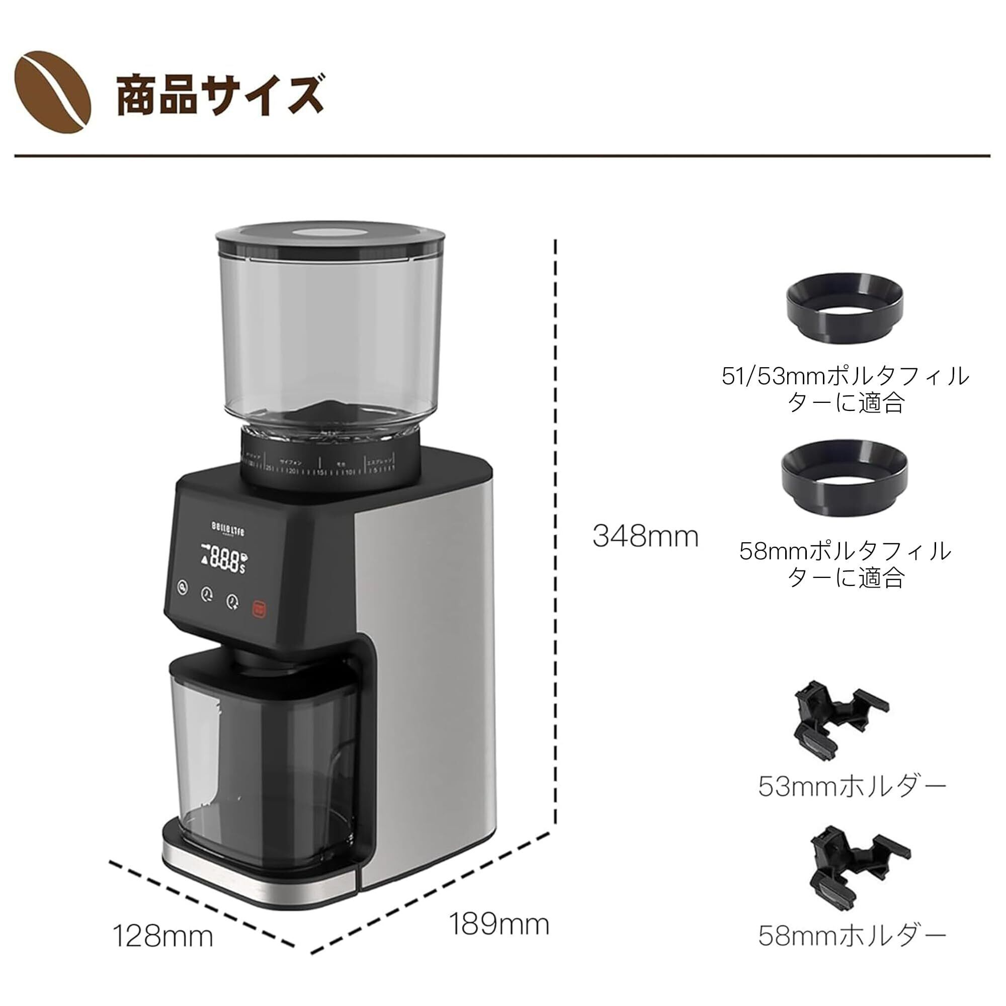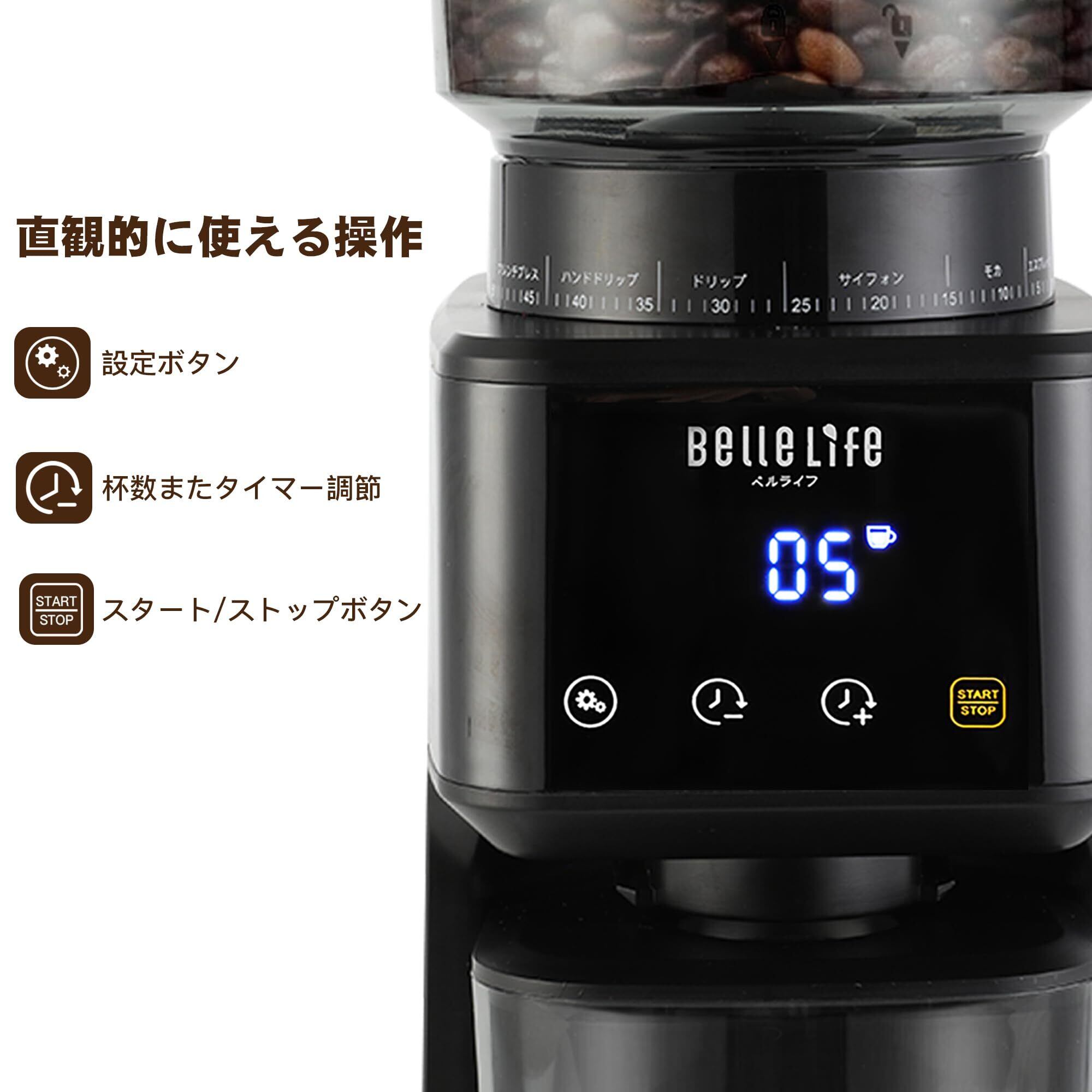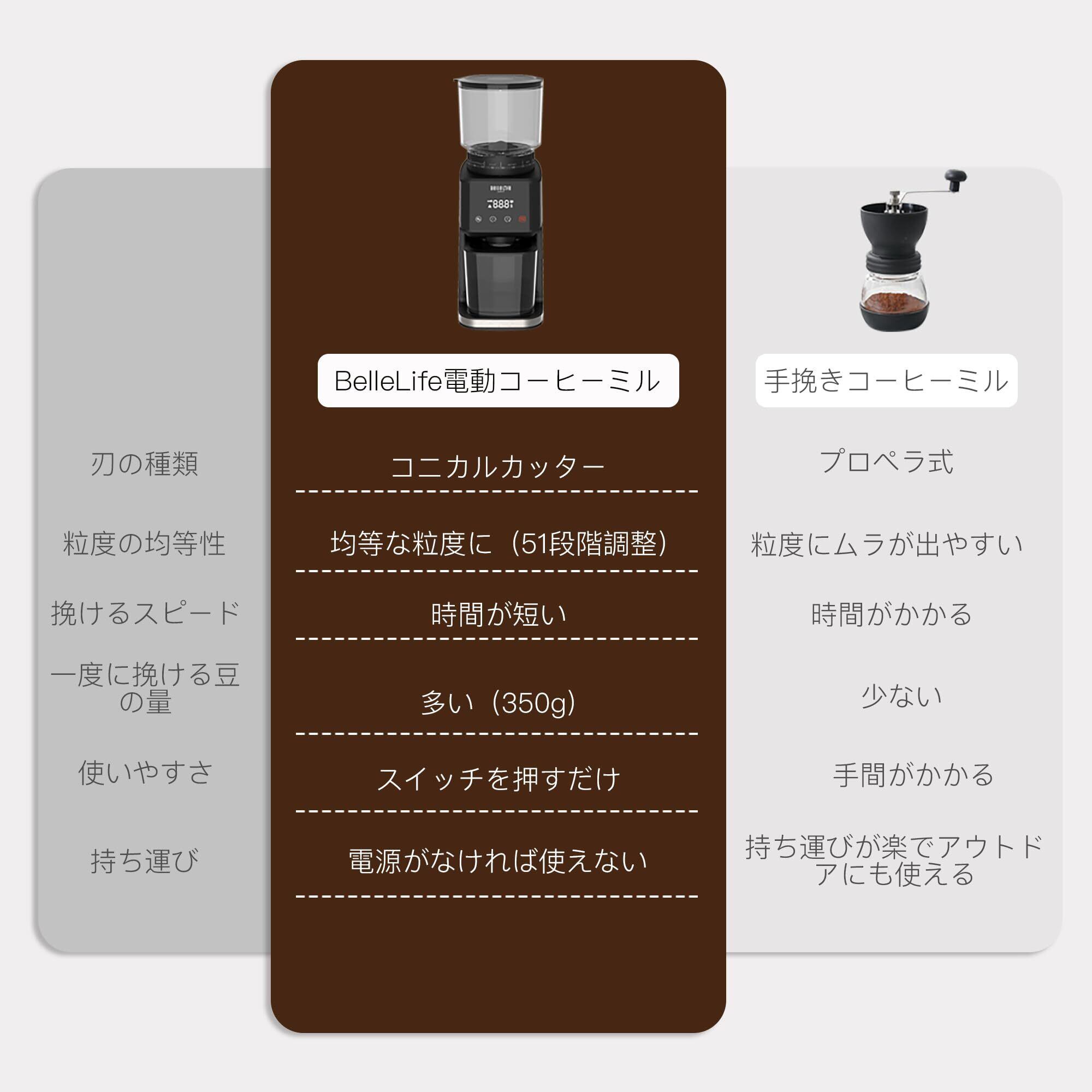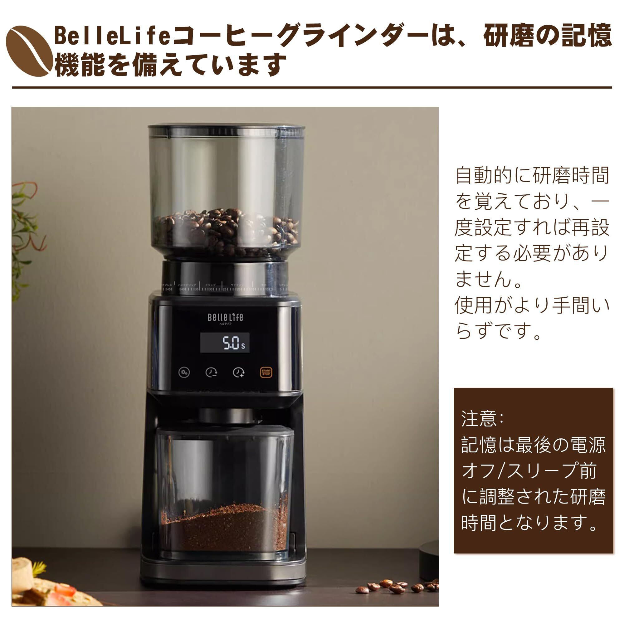 BelleLife 電動コーヒーミル コーヒーグラインダー コーン式コーヒーグラインダー 極細~粗挽き 粒度51段階設定 コーヒー粉砕機 小型 珈琲ミル 静電気飛散防止 大容量 豆挽き 粉末 取り外し可能 掃除ブラシ付 BD-CG018