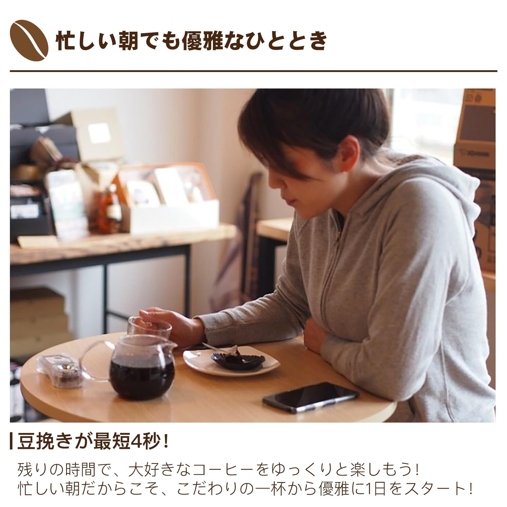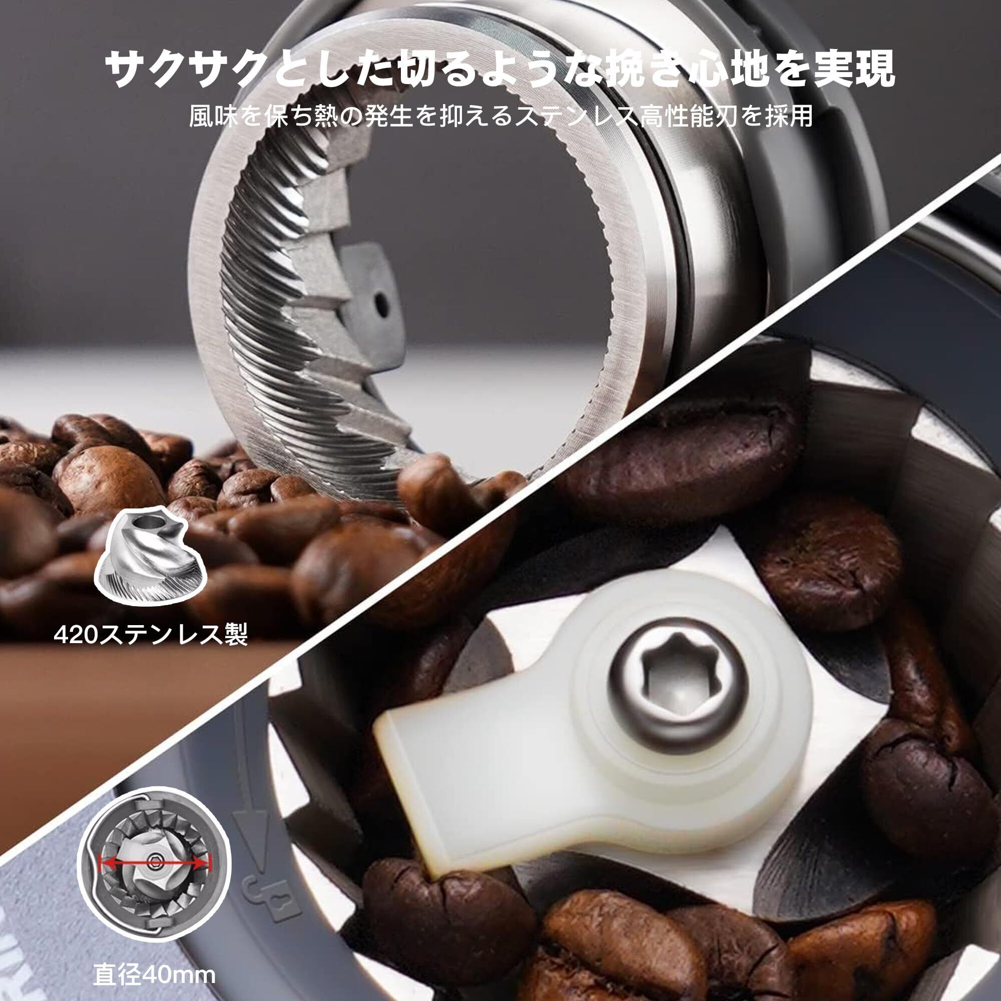 【耐久性・51段階微調整】高品質素材と頑丈な構造で、長く愛用できる耐久性。コンパクト設計でキッチンやオフィスの限られたスペースにもフィット。51段階の粉砕調整により、エスプレッソからフレンチプレス(圧力抽出)まで、あらゆる抽出方法に最適な挽き具合を実現。プロ級の味わいをご自宅で手軽に。