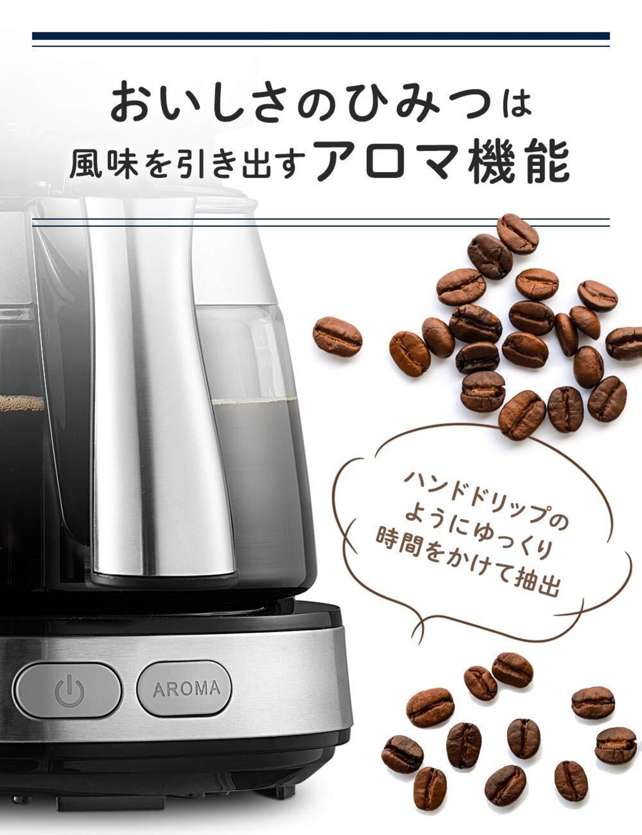 おいしさへのこだわり:4つの穴から給湯し、ムラなく注ぐシャワードリップ機能/ハンドドリップのようにゆっくりアロマを引き出すアロマ機能/抽出後40分風味を保つ保温機能を搭載。