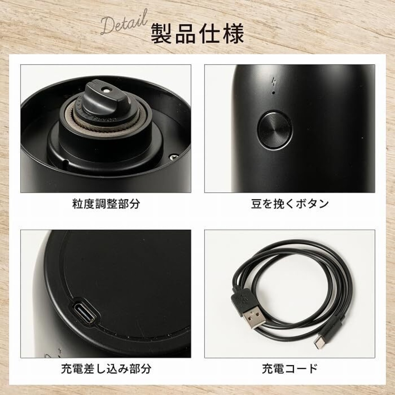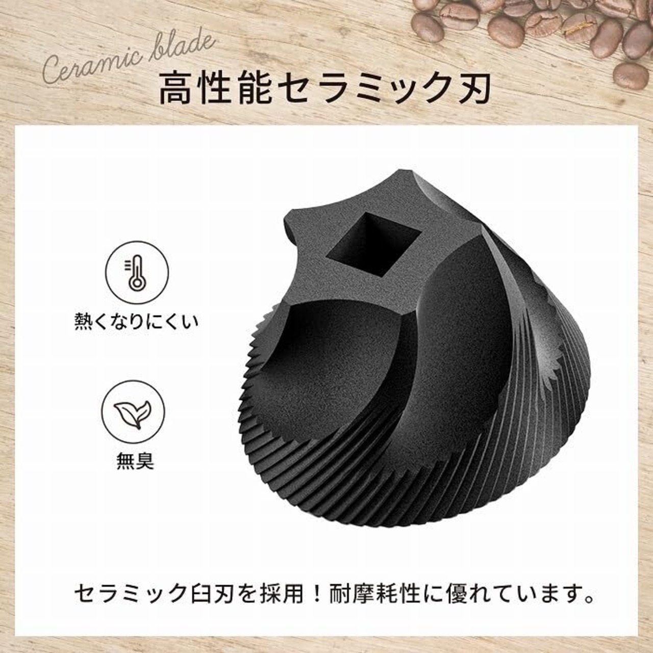 コーヒーミル 電動 臼式 セラミック製の刃 自動停止 無段階調整設定 USB充電式 バッテリー内蔵 1800mAh ミルミキサー 掃除ブラシ付 お手入れ簡単(ブラック)