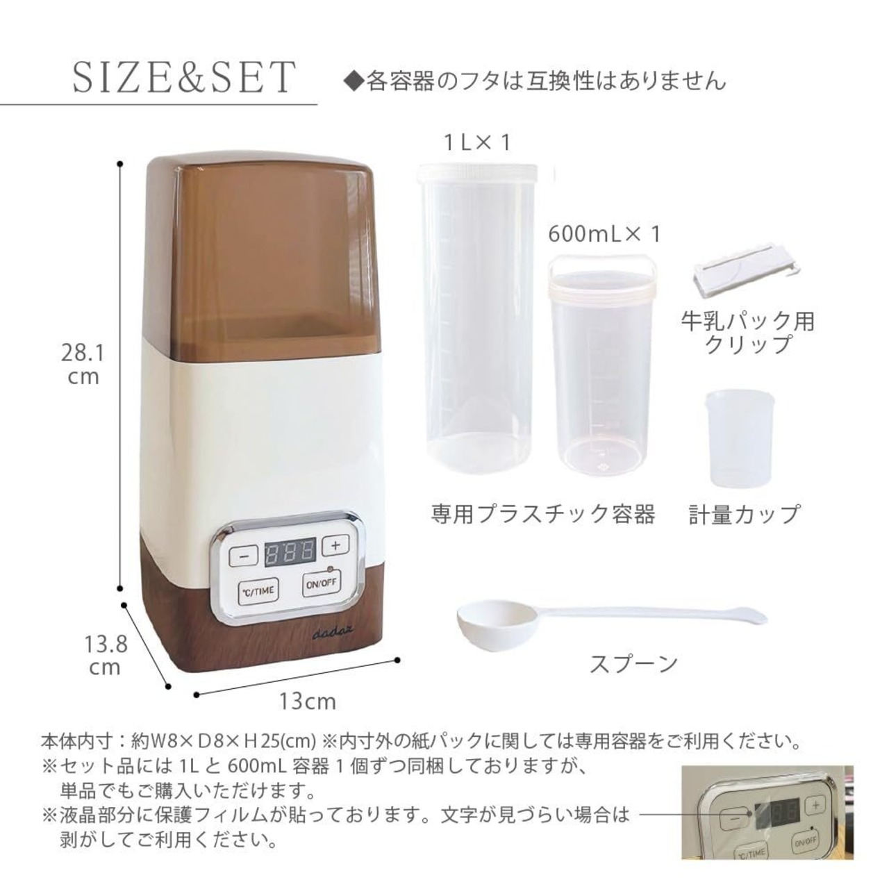 【セット内容】 ヨーグルトメーカー本体 / レシピ本 / 専用容器1L / 専用容器600ml /スプーン×1(約24cm)/ 計量カップ / 牛乳パック用クリップ / 6ヵ月製品書付取扱説明書