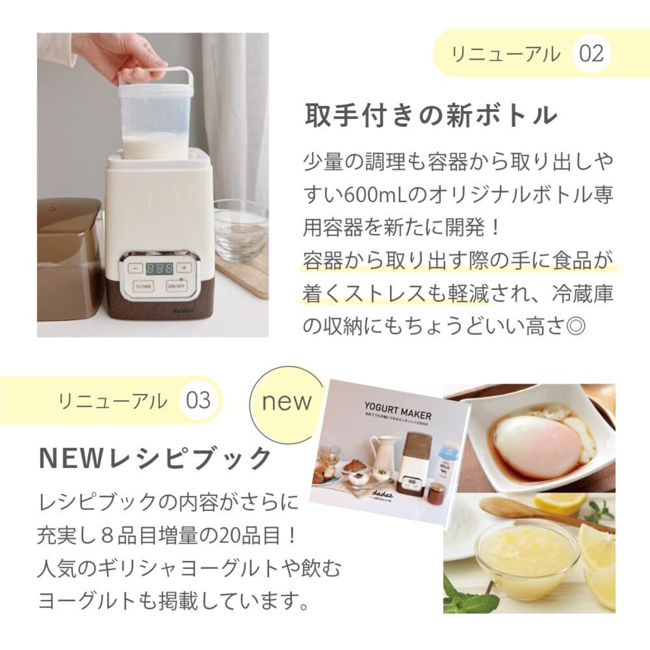 【特徴】■万能調理器 ヨーグルトや発酵食品などがこれ一大で手軽に作れる万能なヨーグルトメーカーです。 ■牛乳パックをそのまま 専用容器の使用はもちろんですが、市販の牛乳パック(1L)もそのまま使用できるのでより手軽にヨーグルトが作れます。 ■レシピブック付き 初めてでも手軽に調理ができるよう、12種類のレシピを掲載したレシピブック付き。