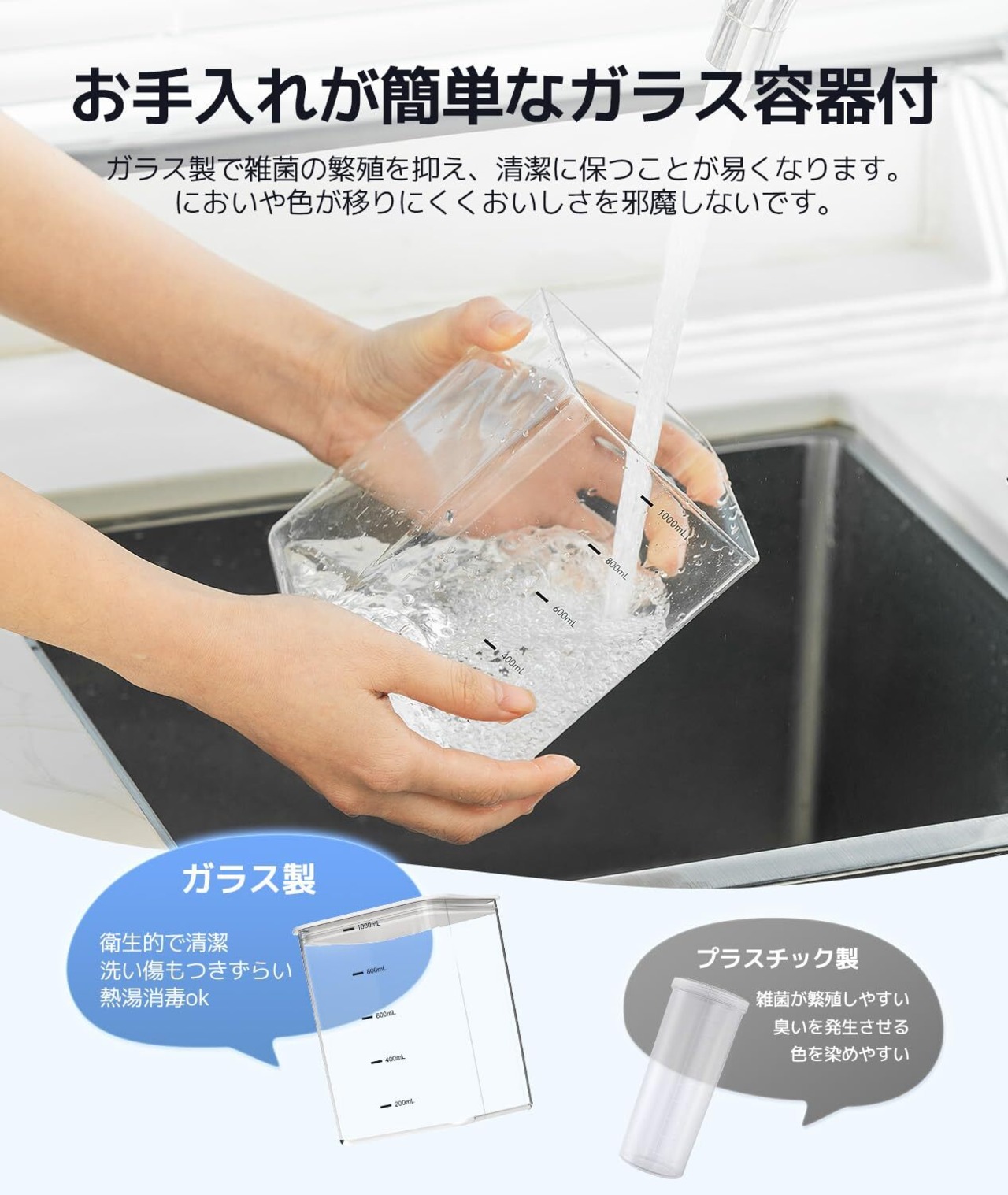 【専用ガラス容器・牛乳パック対応】1L専用ガラス容器付きます。ガラス製で雑菌の繁殖を抑え、清潔に保つことが易くなります。においや色が移りにくくおいしさを邪魔しないです。その上、佇まいを格上げ上質感が溢れます。1L牛乳パックの対応はもちろんです。