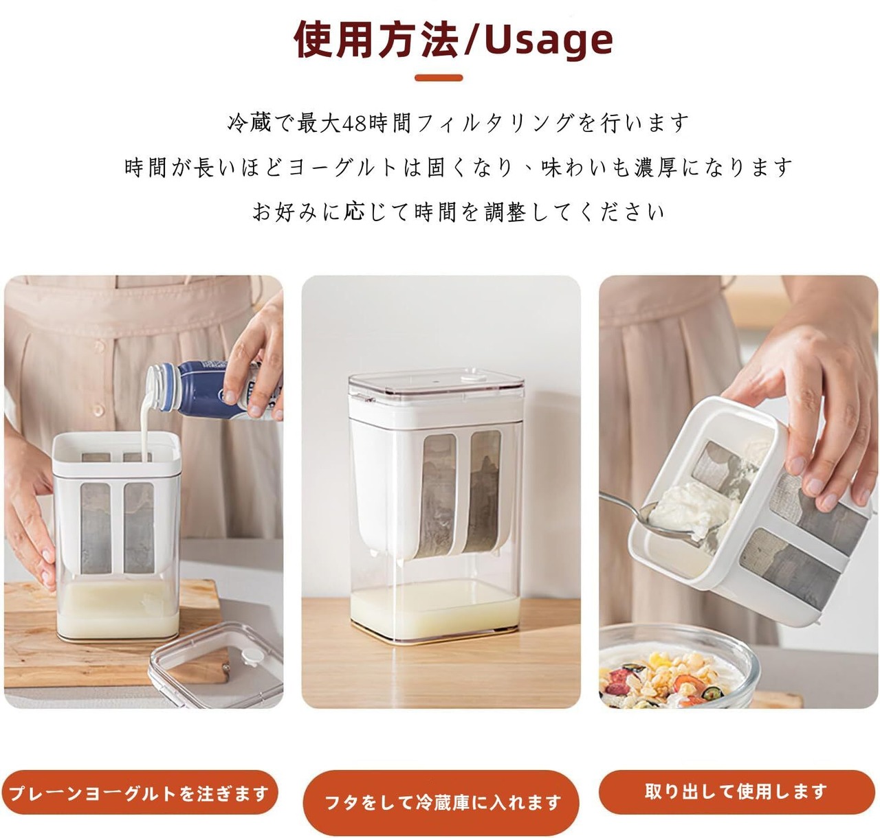️【ヨーグルトの味を格上げする精密なフィルター】冷蔵下で48時間以内に精密なろ過が行われ、時間が長いほどヨーグルトが固まります。お好みの味に合わせてろ過時間を調整可能。ギリシャヨーグルトや薄めのミルクを使用する場合は、フィルターにガーゼを重ねると効果的です。