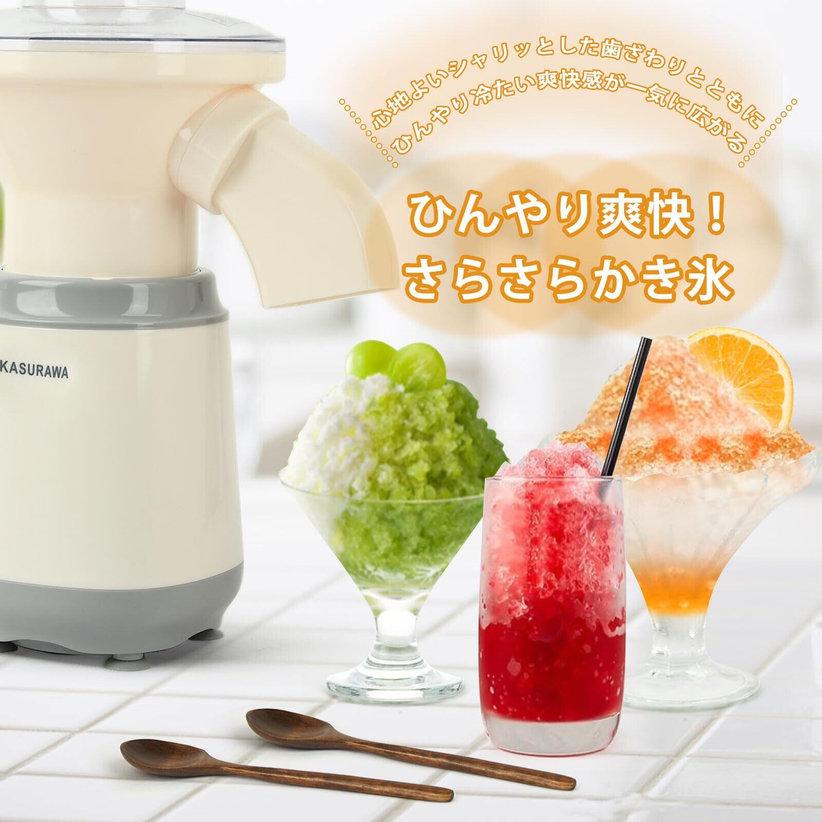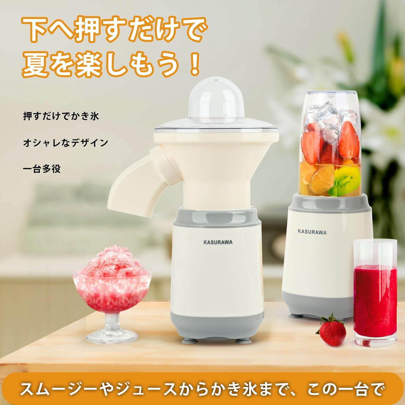 Kasurawa かき氷機 電動 かき氷器 バラ氷 市販氷 冷凍フルーツをそのまま削れる スムージーミキサー ボウル付き スムージー作り 1台多役 かき氷メーカー 押すだけでシャリシャリ食感氷を作り 氷砕く お手入れ簡単 日本語説明書とレシピ付き