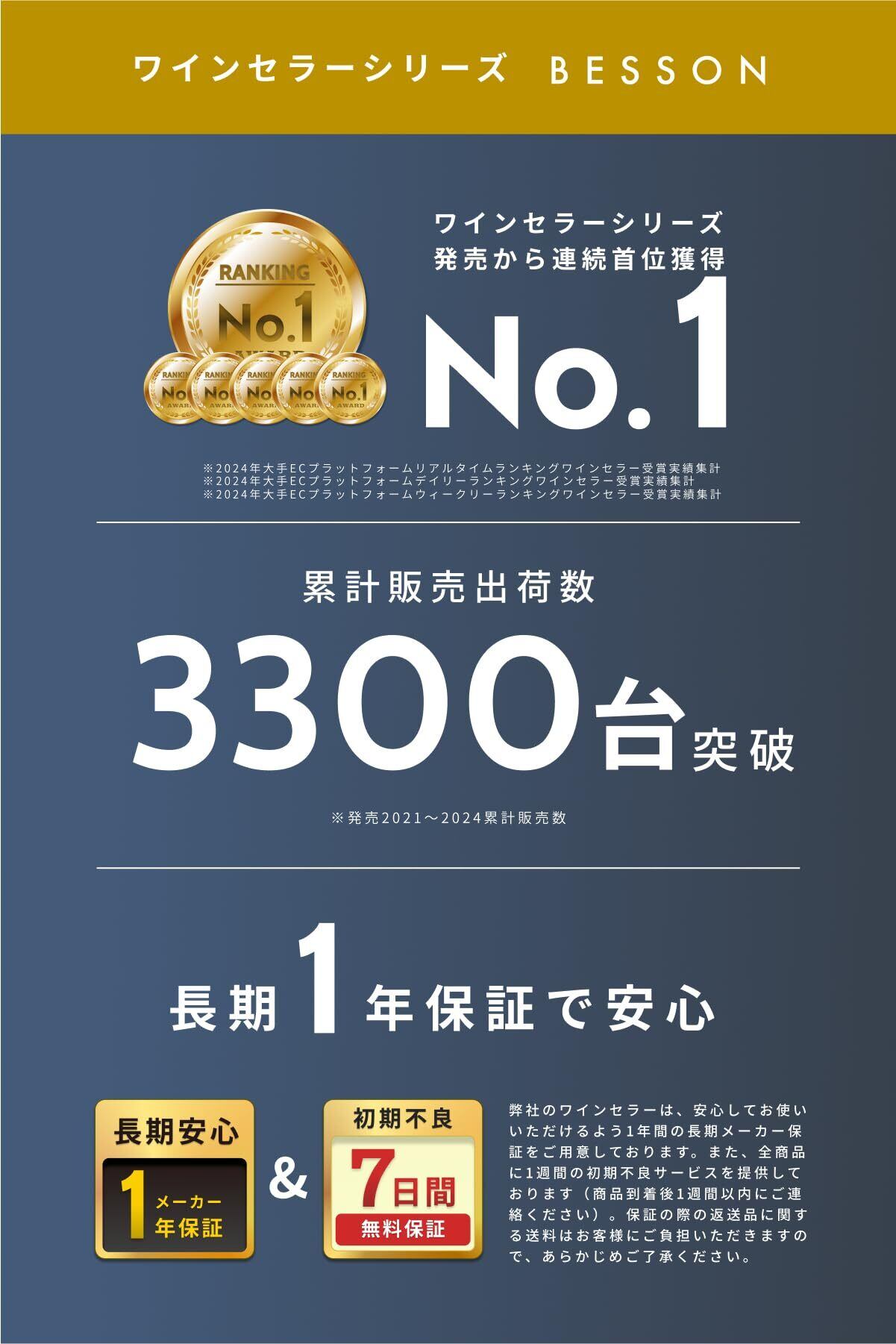 1年間のメーカー付き ワインセラーBessonは、お客様に長くお使いいただけますように 長期メーカー期間(1年間)を設けております。(修理の際に商品を返送いただきますので梱包資材の保管お願い致します) 何か不備がございましたら、修理をさせていただきますのでお気軽にお問合せください。
