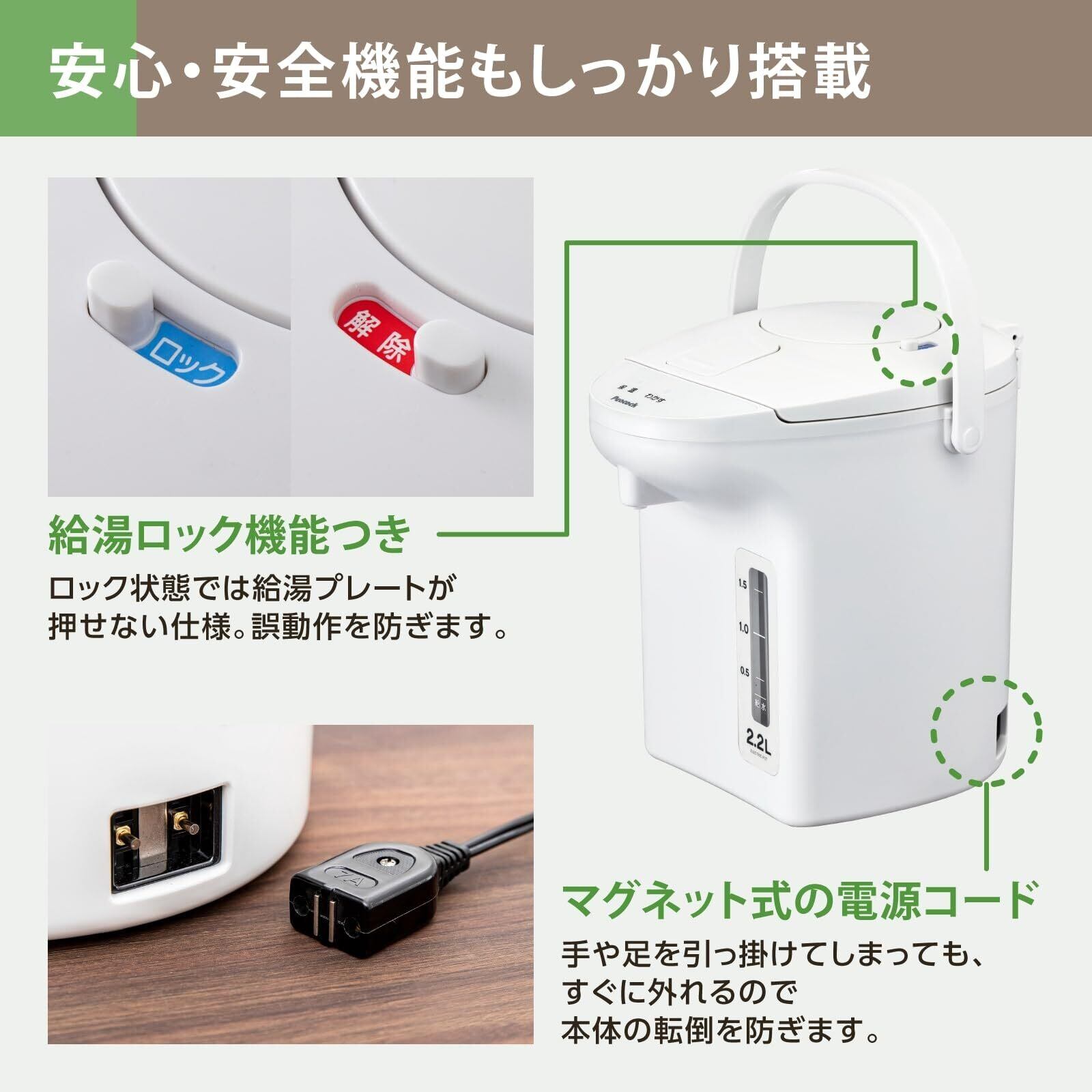 【誰でも簡単 使いやすさを追求】 ピーコック 電気ポット 2.2リットル WEB限定モデル ホワイト WVP-22 WA/安心機能 お手入れ簡単 ポット 保温ポット 湯沸かし 電気 保温 エアーポット 小型 2.2l