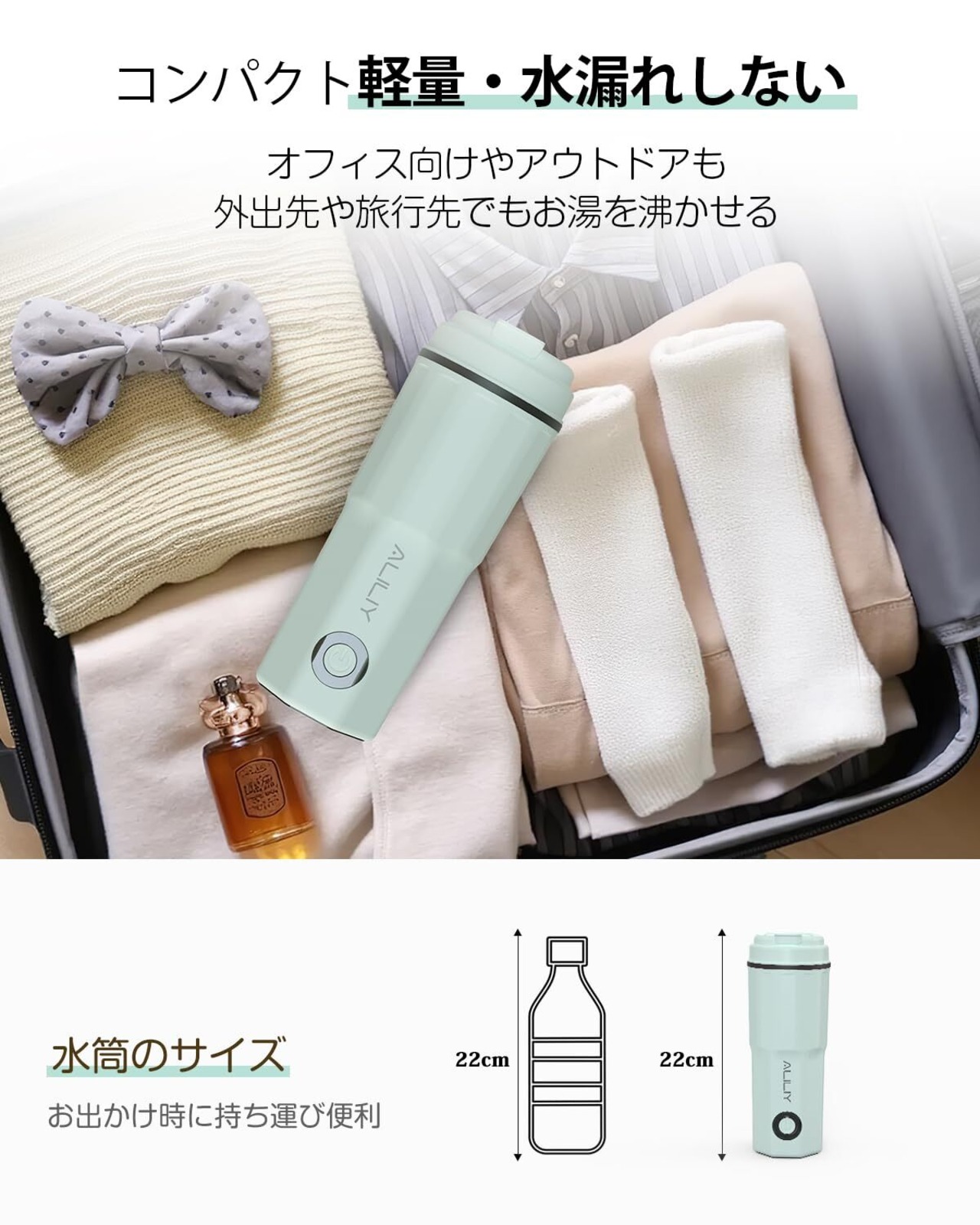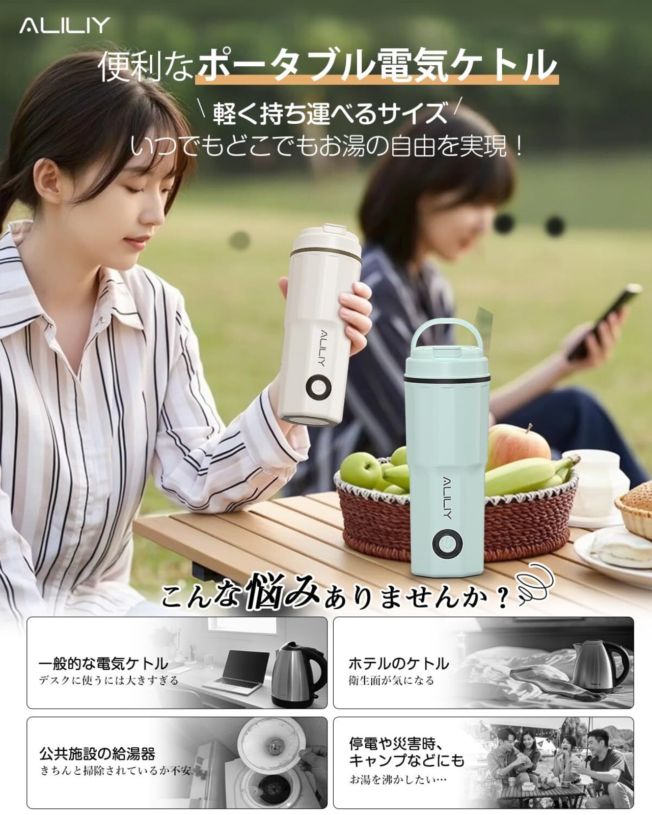 【理想の生活を追求!軽量小型で持ち運びる】Aliliy携帯用400mlのポータブル電気ケトルは小さいサイズで職場のデスク上に置いても場所を取らないです。小型軽量でバッグやスーツケースに入れて持ち運びやすく、コンセントやポ-タプル電源に繋けば、いつでもお湯が沸かせます。小型電気ポットは衛生面が気になる人や、出張先や旅行先や外出先でも温かい飲み物を楽しみたい方にぴったりです。仕事・家事・勉強・旅行などの途中でお湯を沸かしコーヒーブレークで「美味しい時間」を楽しむ!