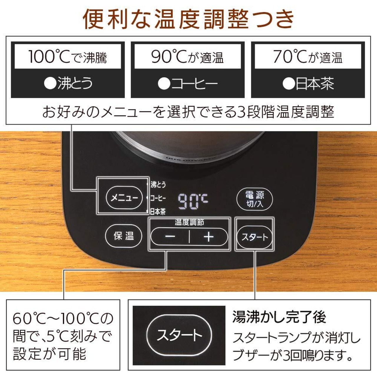 【温度調整】温度調整ボタンを押すと60℃~100℃の間で5℃刻みで設定が可能です。100℃(沸騰)、90℃(コーヒー)、70℃(日本茶)のそれぞれ3段階があり、メニューボタンで適した温度設定ができます。【保温機能】湯沸かしが完了してから保温ボタンを押すと、保温を開始します。冷めることなく、暖かさを持続したままお召し上がりいただけます。しかし、保温を開始してから1時間経つと、保温ランプが消灯し、保温を終了しますので、ご注意ください。【お手入れ簡単】フィルターは取り外しが可能なため、細かい所まで清潔を保てます。 お手入れしやすく、清潔を保てる。