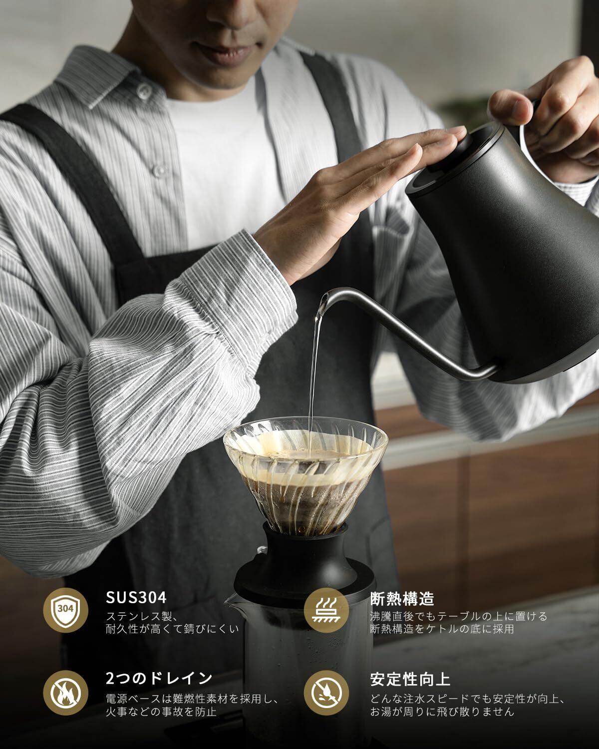 【バリスタ監修のもと、安全性と安心感を追求したコーヒーケトル】① 1200Wの高出力ヒーターにより、カップ1杯分なら約70秒で素早く沸騰。忙しい朝でも手軽にお湯を準備できます。② 食品衛生面でも安心のSUS304ステンレスを、職人の手で丁寧に仕上げています。③ 水量がひと目でわかる水位メモリと、空焚きを防止する安全機能を搭載。④ ハンドルは本体の熱が伝わりにくい一体型設計で、ヤケドのリスクを軽減。⑤ 蓋の蒸気口は、蒸気が手に直接当たらないよう配慮された角度で設計されています。⑥ スリムで省スペースな電源ベースは、難燃性素材を使用し、安全性を向上。さらに2つの排水ドレインにより、万が一の事故も予防します。⑦ ケトルの底部には断熱構造を採用し、沸騰直後でもテーブルにそのまま置ける安心設計です。
