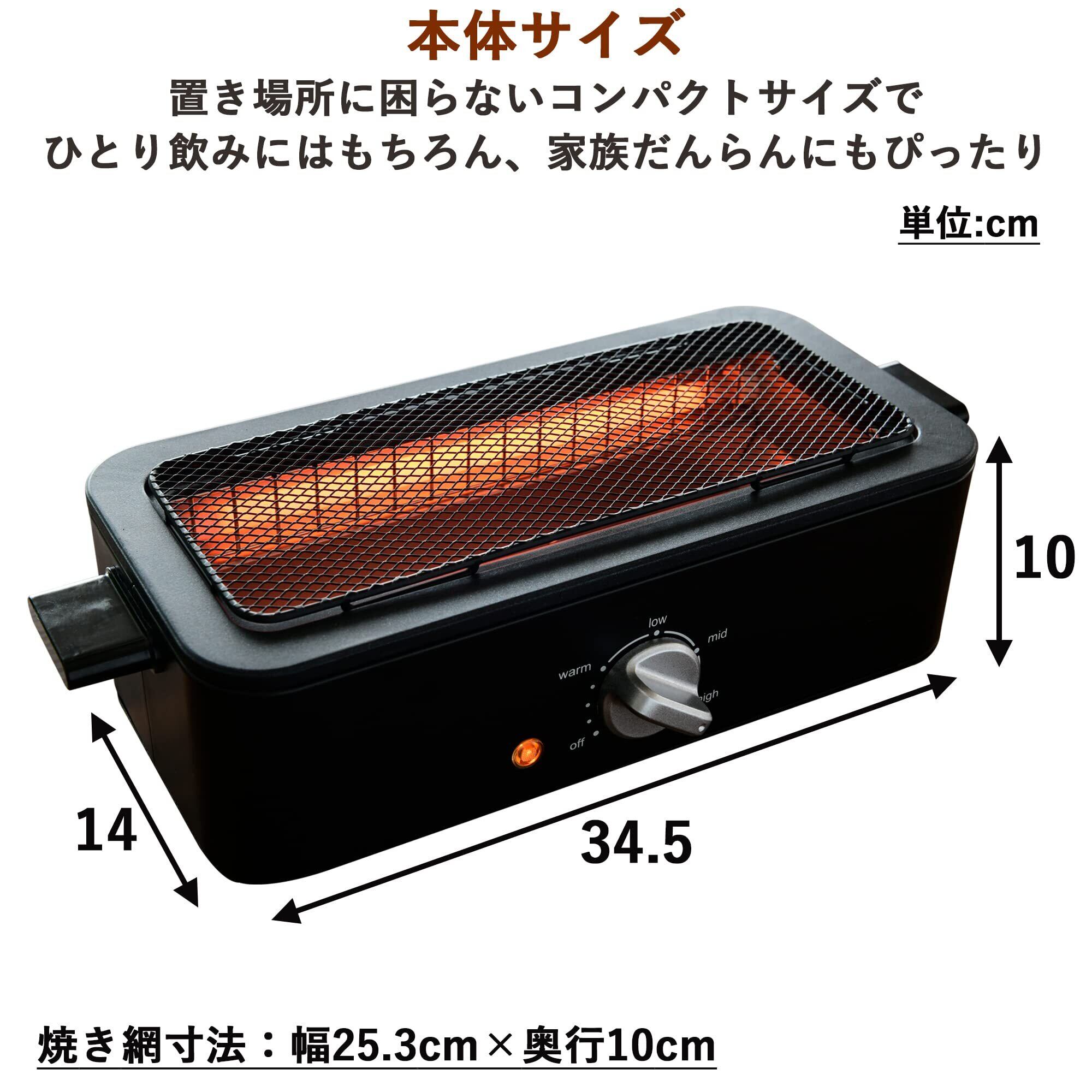 【商品仕様】◇本体サイズ:幅34.5×奥行14×高さ10cm ◇焼き網寸法:幅25.3×奥行10cm ◇本体重量:1.3kg ◇電源コードの長さ:1.2m ◇電源:交流100V(50/60Hz) ◇消費電力:1000W ◇期間:お買い上げ日より1年間(の範囲については、取扱説明書をご確認ください。(一般家庭用以外(業務用など)に使用された場合の故障及び損傷などは対象外となります))