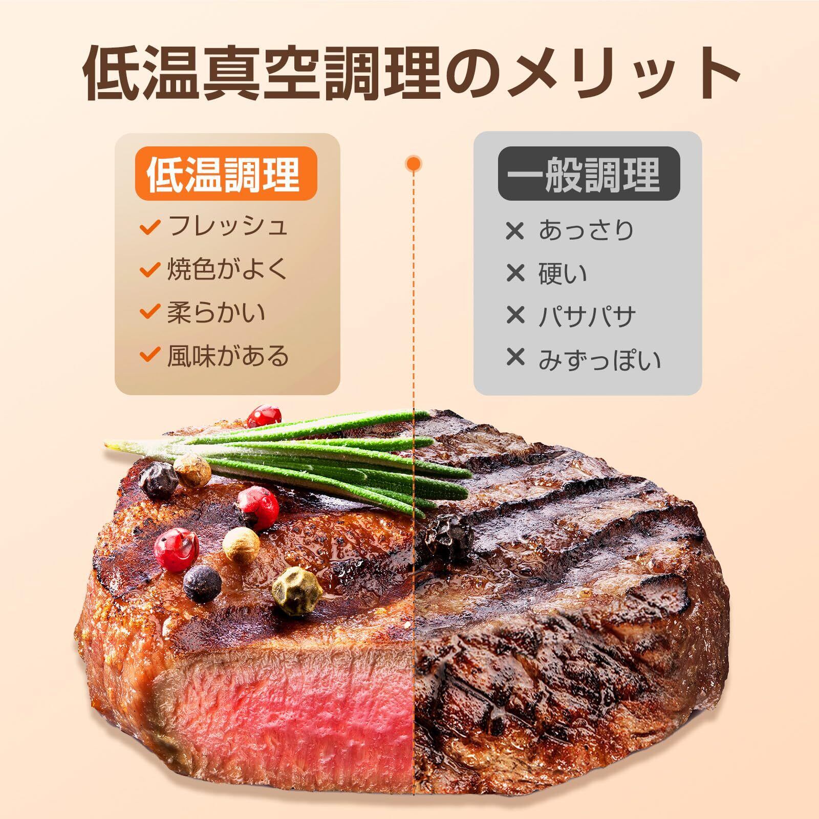 【低温調理 最上級クラスの料理を味わう】低温調理器を使うことで、火加減がコントロールしにくい食材を一定の温度で加熱させることが可能。なお、多様なレシピがつくことで、たとえ料理に苦手な方が使ってもミシュランの星を獲得したレストランのシェフのようなパフォーマンスが再現できる。低温調理法は食材の元の味を引き出せる秘訣である。肉の水分を保つ上、肉質をさらにやわらかくすることで、豊かな風味が味わえる。