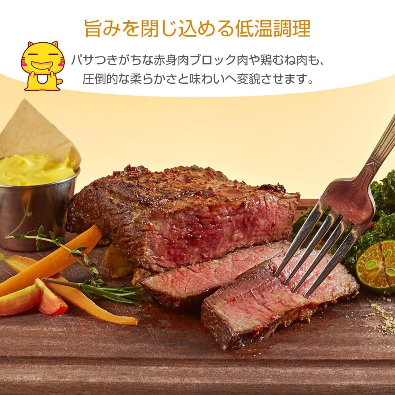 【細やかな温度調節】温度設定は25~95℃、精度±0.1℃、時間設定は0~99時間まで1分単位。 時間と温度を細かくコントロールすることで、食材をベストな状態で調理できます。 様々な食材を調理可能 温泉卵、鶏胸肉、ステーキ、サーモン、野菜など、温度を自由に設定できるので、様々な食材を簡単に調理できます。
