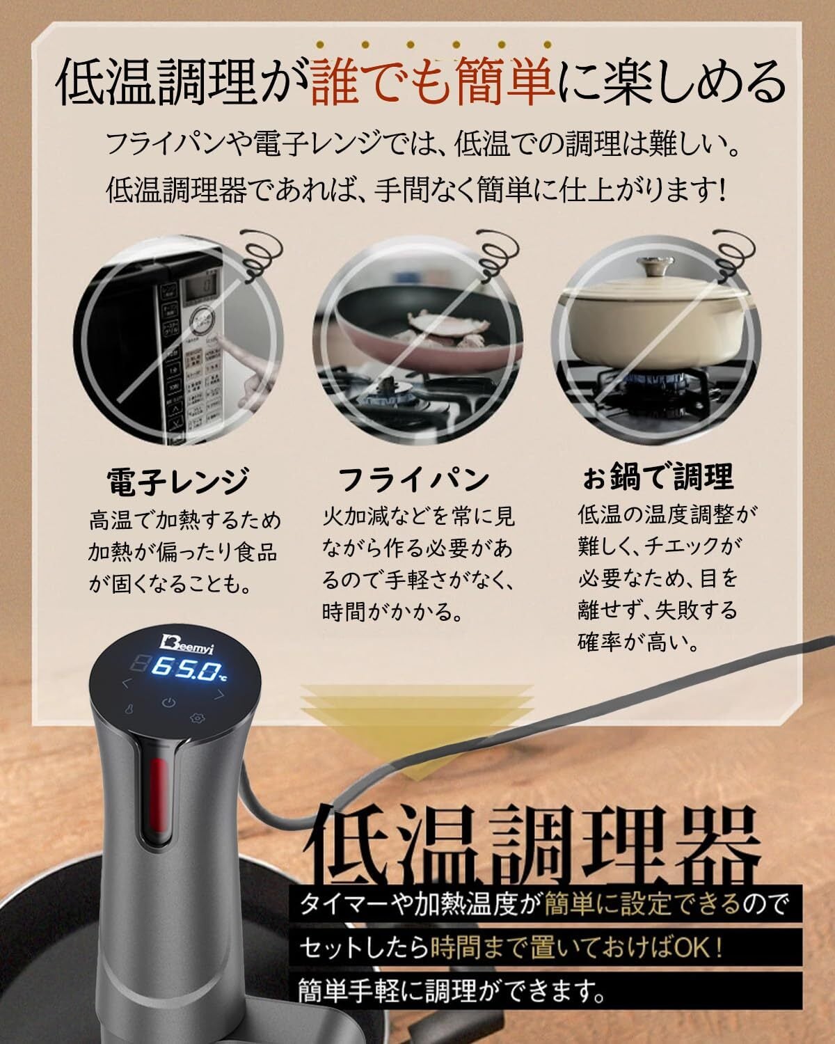 【低温調理のメリット】❶火を使わない調理のため”ながら”作業が可能 ❷食材の酸化を防止。発がん物質の分泌を抑制。❸簡単に失敗しない料理が作れる手軽さ❹素人でもシェフ顔負けのワンランク上の料理が作れる ❺低温調理をすることで栄養価が高くなり、パサつきやすい食材が美味しく仕上がる。❻片付けがらく。