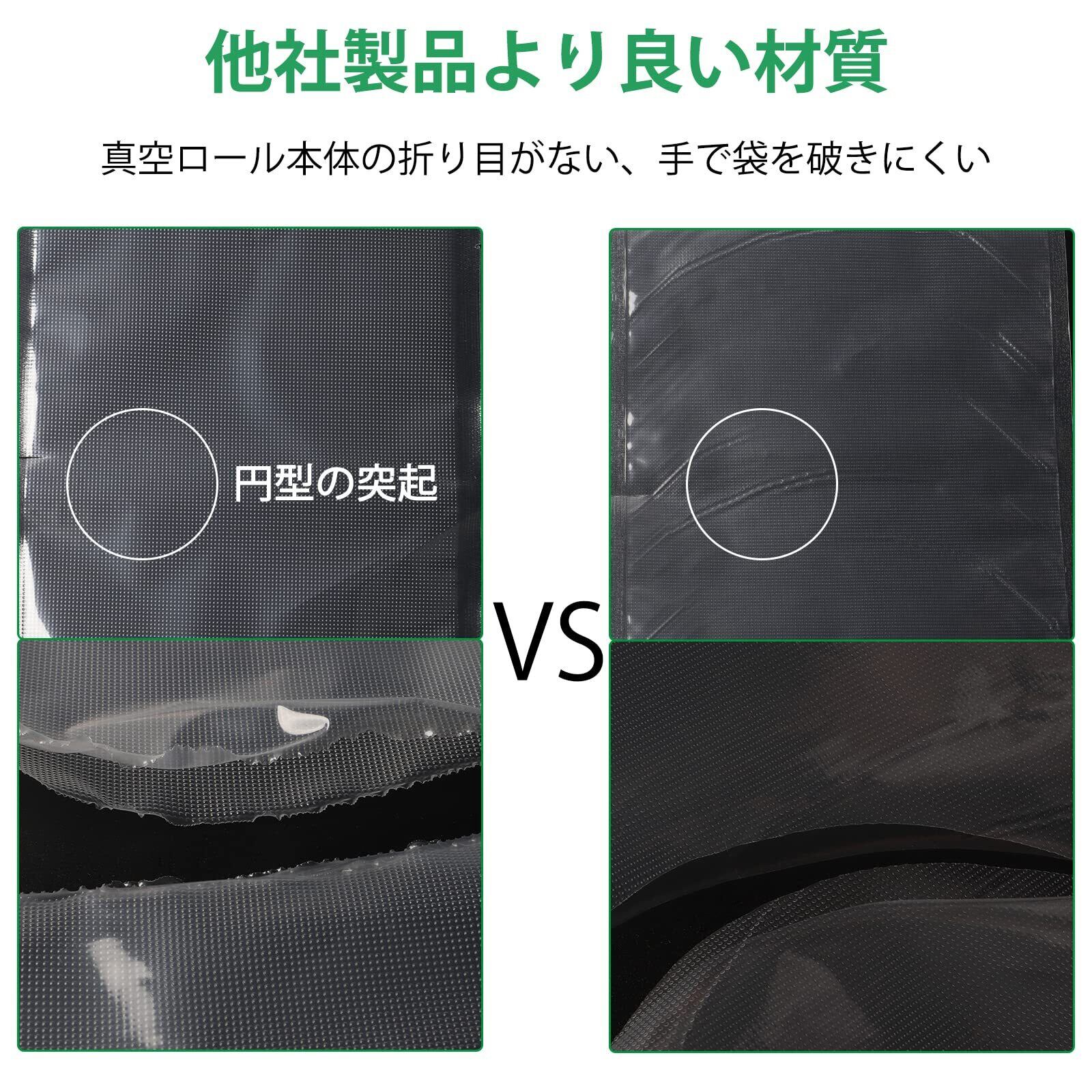 【エンボス加工】 片面はなめらかかつ透明で、もう片面にはエンボス加工が施してあるので、空気を逃がしやすく、吸引性能も高くなっています。あらゆる真空包装機に対応します。電子レンジを使って解凍、加熱が可能です。加熱時は、必ず袋に凹凸を作ってください。また、食材に大量の油分が含まれている場合は、袋が裂ける可能性がございますので、容器に移してから加熱することをおすすめします。