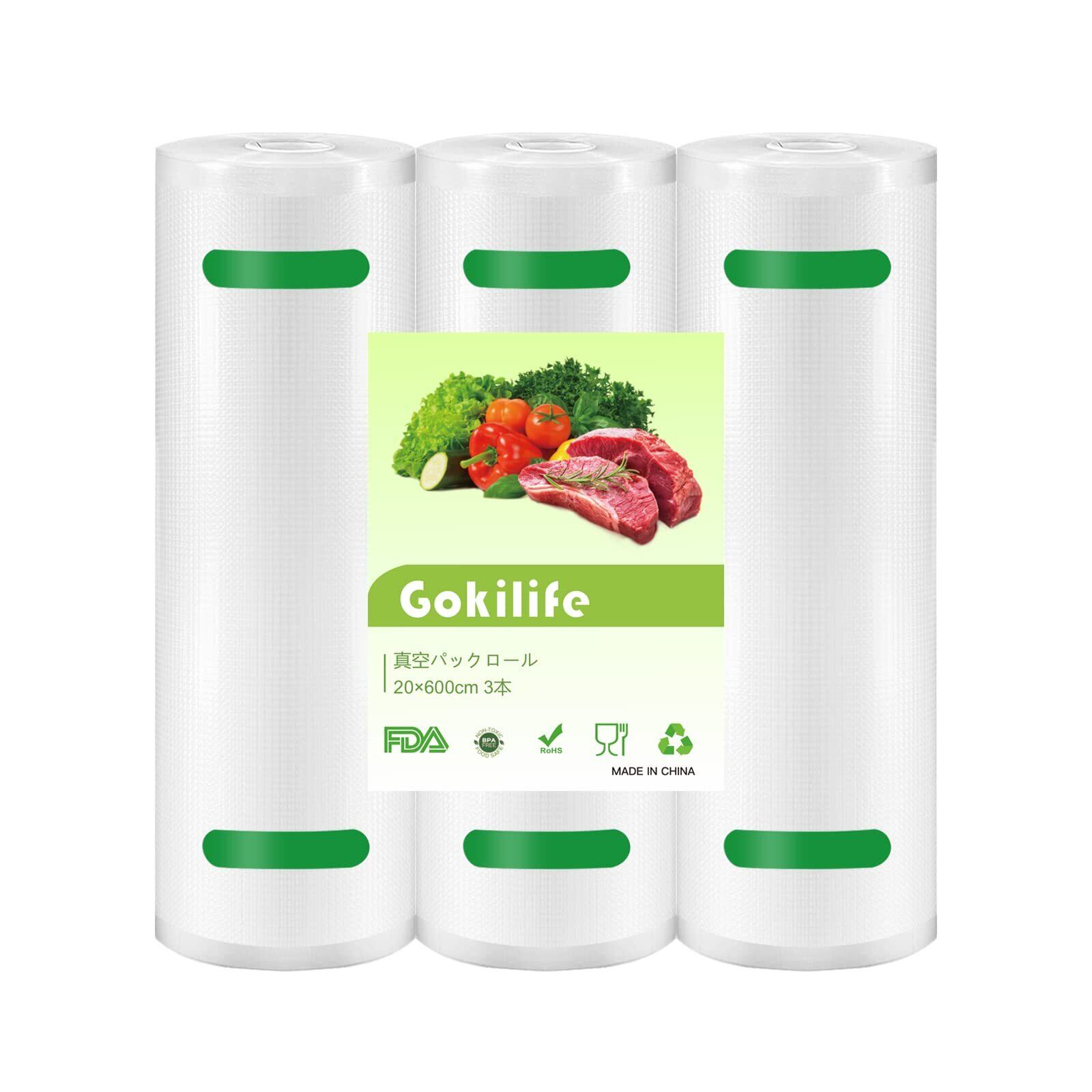 Gokilife 真空パック袋 真空パックロール 20*600cm 3本セット - 真空パック機専用ロール 替えロール 真空ビニール エンボス加工 真空包装袋 専用抗菌袋 脱気密封 鮮度長持ち 食品保存 低温調理 PA+PE安全素材 自由にカット 家庭用 業務用