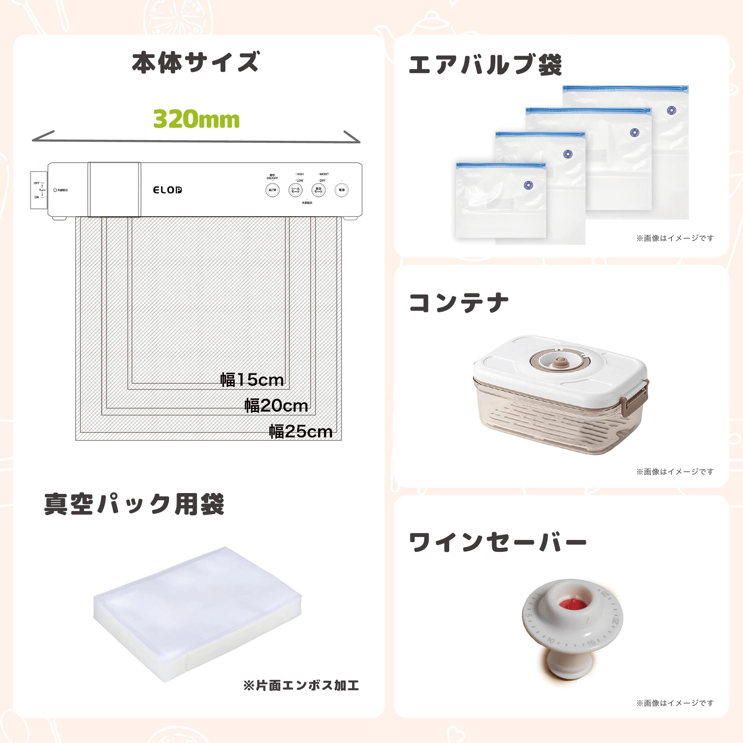 【専用袋不要、さまざまな袋に対応】付属のSサイズの真空パック袋以外にも、市販のエンボス加工の真空パック用の袋も使用できます。本体側面に搭載された「外部吸引口」を使えば、エアバルブ付きの真空パック袋(エンボス加工)やエアバルブ付きの保管用コンテナにも使用ができるのでお財布にも優しい!
