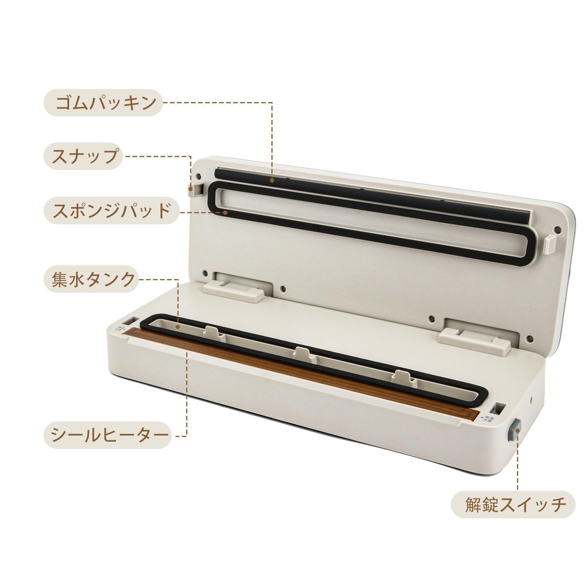 【商品の仕様】商品サイズ(cm):幅約37.5×奥行約13.4×高さ約6.6●本体重量(kg):約1.3●電源電圧:AC100V(50/60Hz共用)●シール可能幅:最大300mm●定格消費電力:90W●脱気力:約60kPa