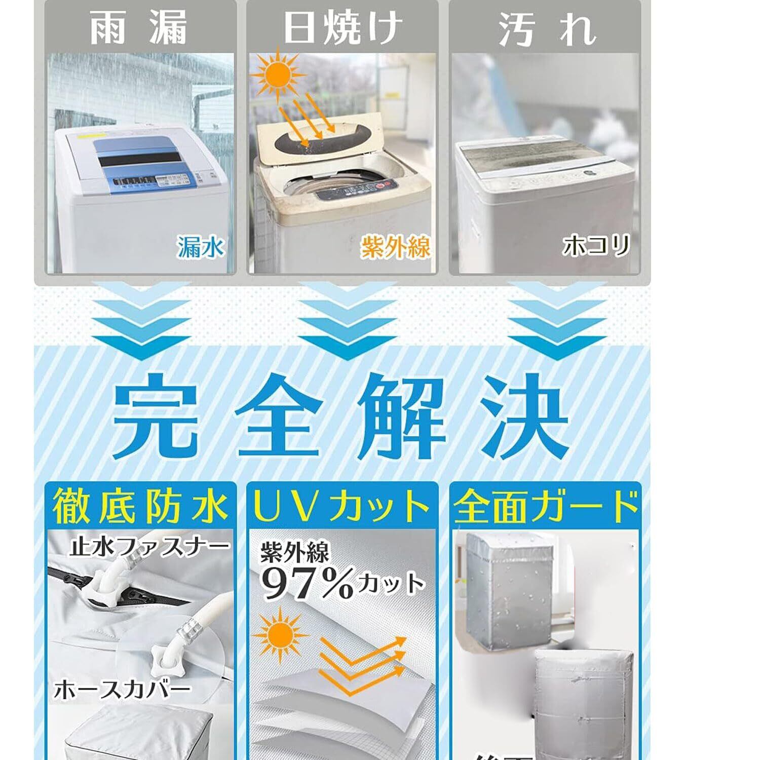 【新しいデザイン】アップグレードされ洗濯機カバーは3面包んでいて、後ろは3本の紐で結びつけられて、製品全体を固定しています。3面デザインにより通気性があり、放熱もしやすくなります。