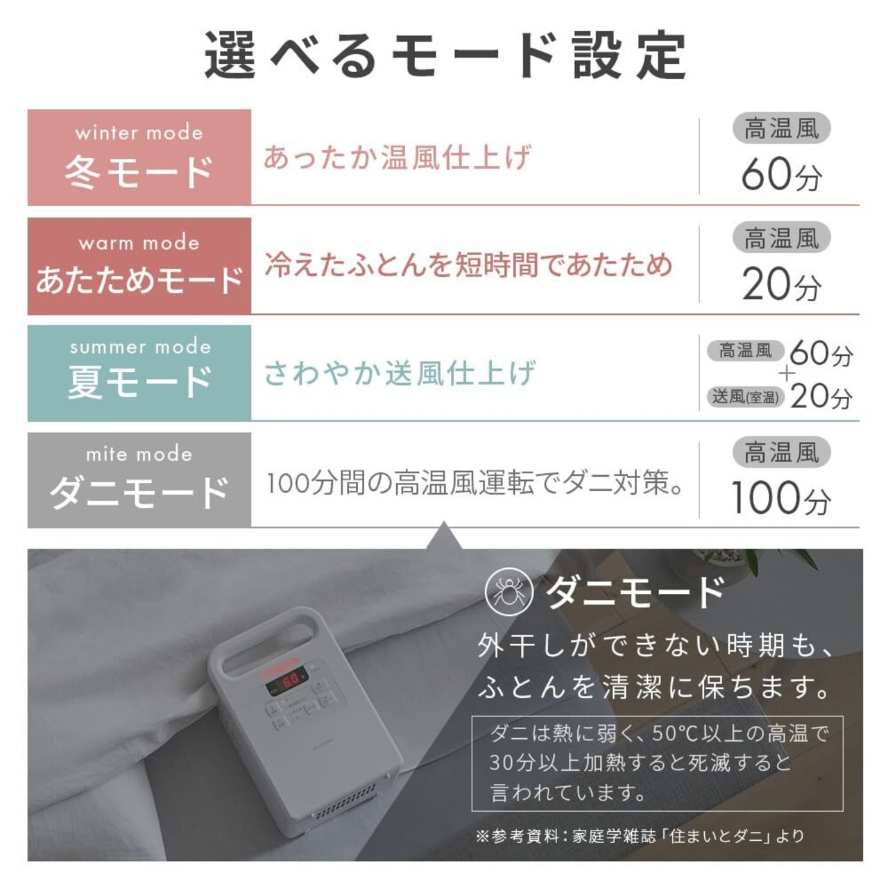 【自動乾燥モード4種】①あたためモード:冷えた布団を短時間であたため。寝る前の使用がおすすめです。②冬モード:あったか温風仕上げ。布団を温め、ふんわり仕上げます。③夏モード:さわやか送風仕上げ。温風でカラッと乾燥。さわやかな風で熱気を逃します。④ダニモード:約50℃以上の温風でダニ対策!天日干しができない時期でも布団を清潔に保つことができます。※ダニは50℃以上の高温で30分以上加熱すると死滅するといわれています。