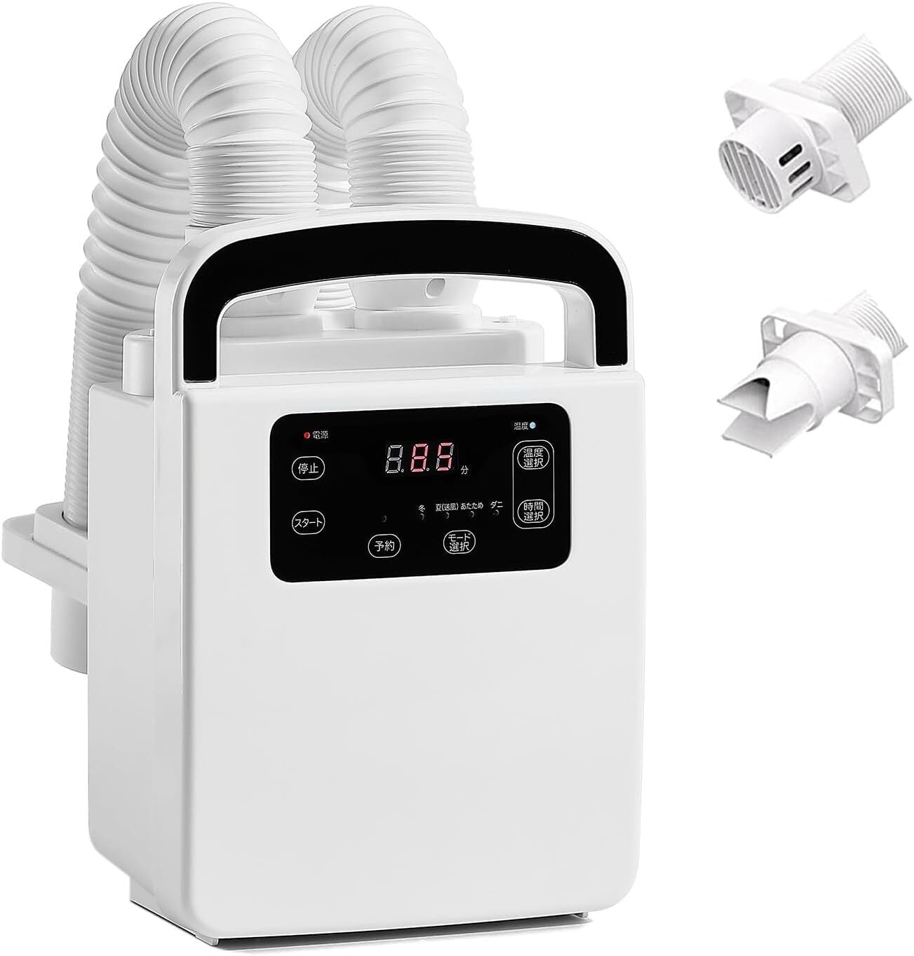 【温度、時間設定・4種類モード・四季適用】手動モードには温度が高温風(70℃)、中温風(50℃)、送風(室温)3階段調節できます。タイマー機能も付いており、15-30-45-60-75-90-120分時間の8段階から選べます。また、自動モードには「冬」、「夏」、「あたため」、「ダニ駆除」4種類があります。冬に布団を乾燥することに限らず、オールシーズンで役に立つところがあります。例えば、夏の汗消臭、春と秋の衣類乾燥、冬の布団温めなど、季節ごとに大活躍です。