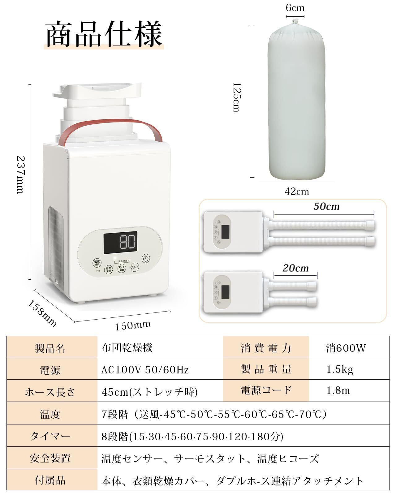 布団乾燥機 【一台多役乾燥セット・革新的な1秒伸縮ホース】衣類乾燥 ダニ退治 靴乾燥 小型 乾燥機 パワフル ふとん乾燥機 衣類乾燥袋付き 布団あたため 温風機能 衣類干し 部屋干し 省エネ コンパクト 軽量 梅雨対策 花粉 黄砂 ダニ対策 時短 湿気対応 (ホワイト)
