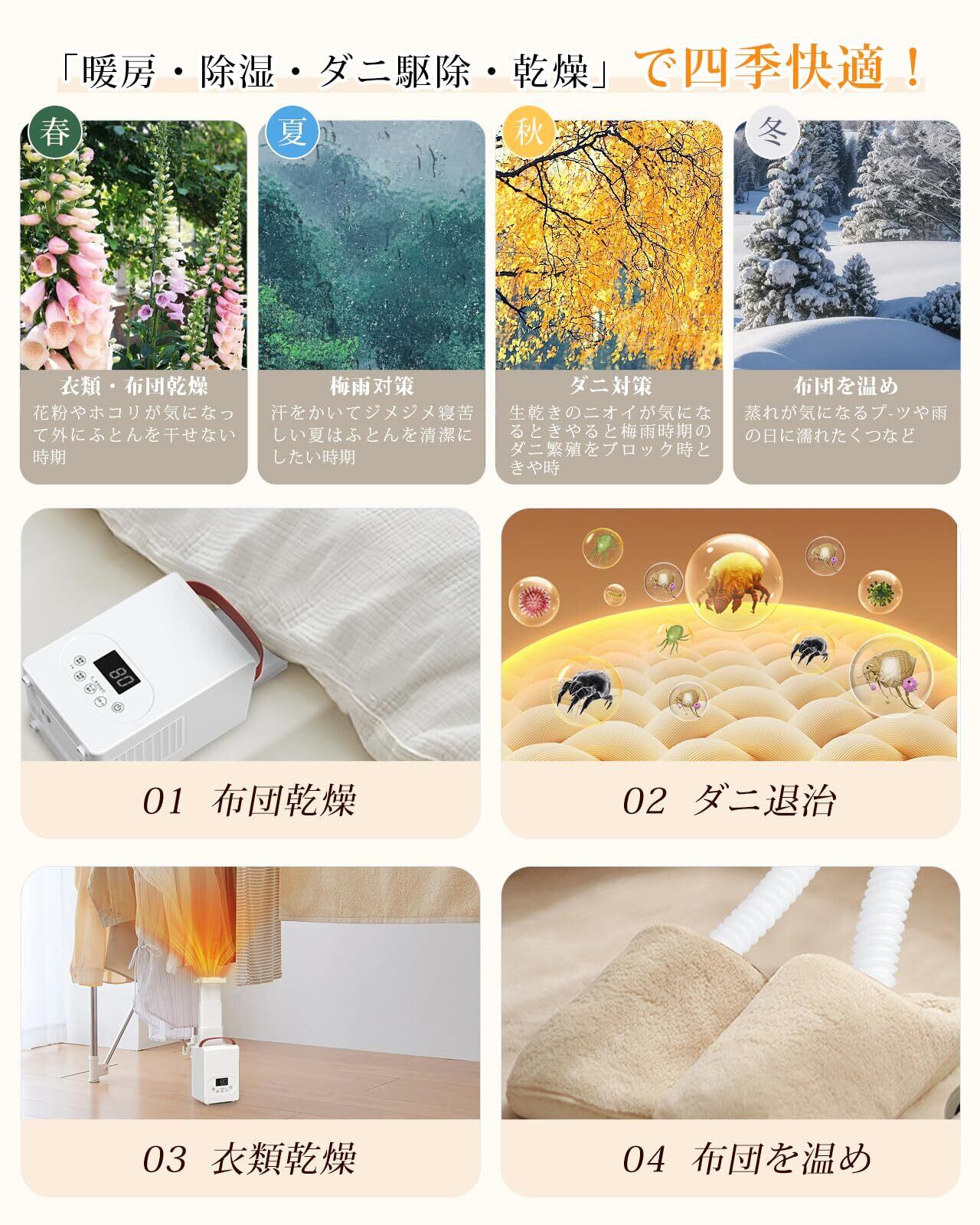 【四季対応の便利な 4つ自動モード】このふとん乾燥機は冬、夏、衣類乾燥、ダニ退治の 4 段階自動乾燥モードを搭載しており、寒い季節には 60 分間の高温風で布団を深層乾燥する冬モードや、暑い時期には高温風 60 分と室温送風 20 分で汗ばむ布団をさっぱりさせる夏モードをはじめ、梅雨の濡れ衣や急な洗濯物に対応する衣類乾燥モード、さらに 70℃の高温風を 100 分間送り込んで布団の奥底までダニを確実に駆除するダニ退治モードも備えており、春の花粉、夏の汗、秋の湿度、冬の寒さ――四季折々の課題を解決し、子供やお年寄りを含む家族全員の快適な生活環境をサポートする必須の生活アイテムです。