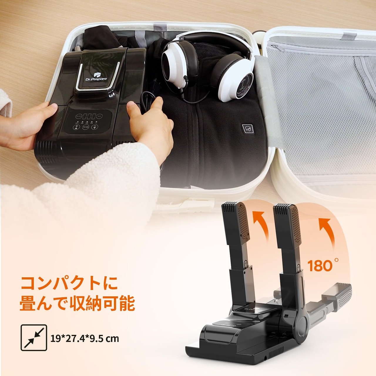 DR.PREPARE 靴乾燥機 シューズドライヤー オゾン 脱臭 折り畳み式 予約機能 3段階温度調節 高温 低温 自然風 スニーカー/雨靴/革靴/サッカースパイク/ボクシンググローブなど対応 通気口を60°拡張し、つま先奥深くまで乾燥 360°効果的な乾燥 日本語説明書付 ブラック 180分