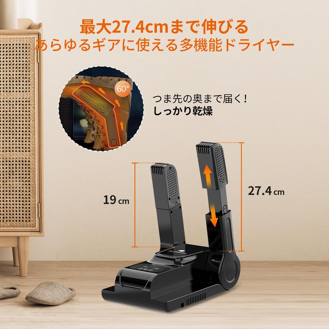 【通気口60°拡張、つま先まで乾燥で360°全方向乾燥】 強化エアフローで乾燥スピードアップ!素材を傷めず、ギアの寿命を延ばします。湿った靴や汗を含んだギアはニオイの原因になり、劣化も早まります。オゾン脱臭機能で常に清潔&長持ち!