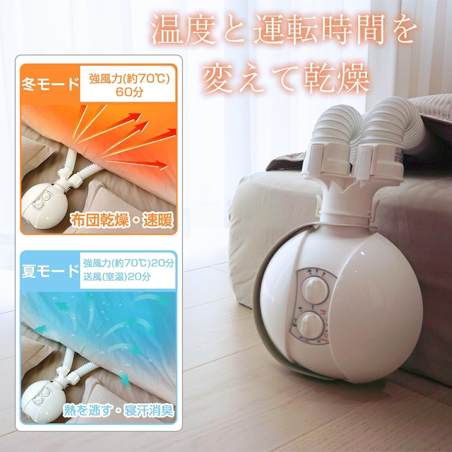 【安全装置付き&お手入れ簡単】PTCセラミック発熱を採用し、高い熱効率で素早く乾燥しながらも、より安全な加熱を実現できる布団乾燥機です。温度センサーとサーモスタットが搭載され、安全な温度を保つよう自動制御し、温度が上がりすぎたときは自動で運転停止できます。また、温度ヒューズもついており、内部温度が上がりすぎた場合は電流を完全遮断し、充実な安全装置により安心してお使いいただけます。また、フィルターを取り外して水洗い可能、お手入れもしやすいです。消費電力は400Wに抑えられ、市販の布団乾燥機より省エネで、一人暮らしの方でも手軽に使用できます。【安心付き】お買い上げの日付より一年のメーカーが付いており、正しい使用方法において、万が一商品に不具合がある場合は、の購入履歴よりまでご連絡いただければ迅速に対応いたします。