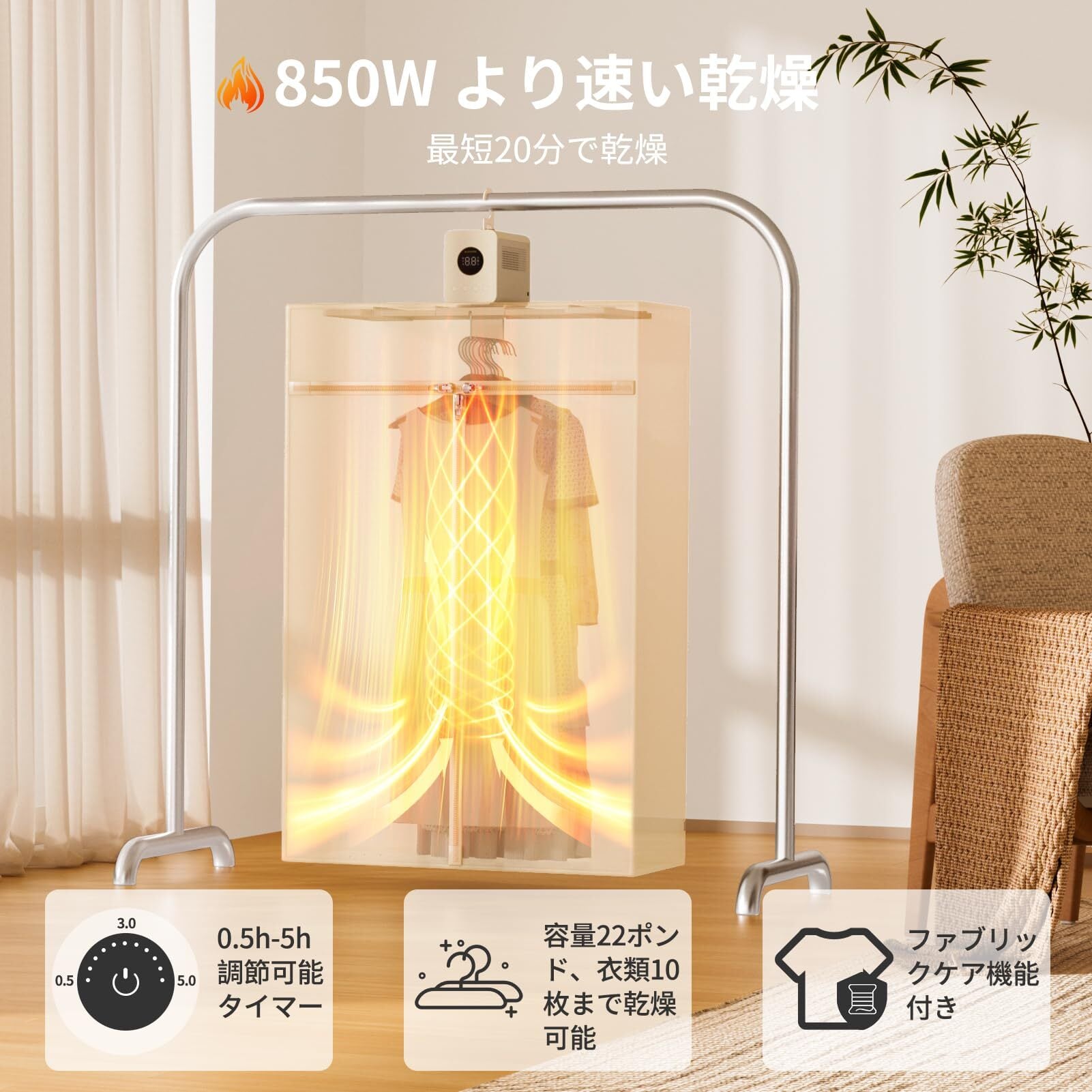 【850Wの高出力】: この乾燥機は、急速乾燥機能、先進のプラズマ技術を備えています。迅速で効率的な乾燥が可能で、同時にプラズマ【機能は細菌や異臭を効果的に除去し、衣類に包括的なケアを提供します。便利で迅速、衣類を清潔で新鮮に保ちます。