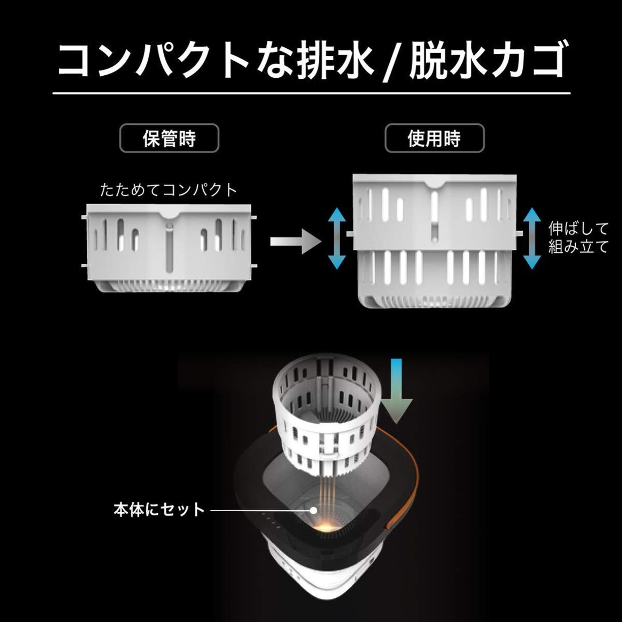 定格電圧:AC100V 定格周波数:50/60Hz 定格消費電力:40W 運転音:60dB 定格洗浄能力:約0.4~0.8kg 外形寸法:使用時292x292x288mm 折りたたみ時292x292x93mm 重量:2.5kg 付属品: 本体、排水/脱水カゴ、ACアダプター、収納袋、取扱説明書(書)