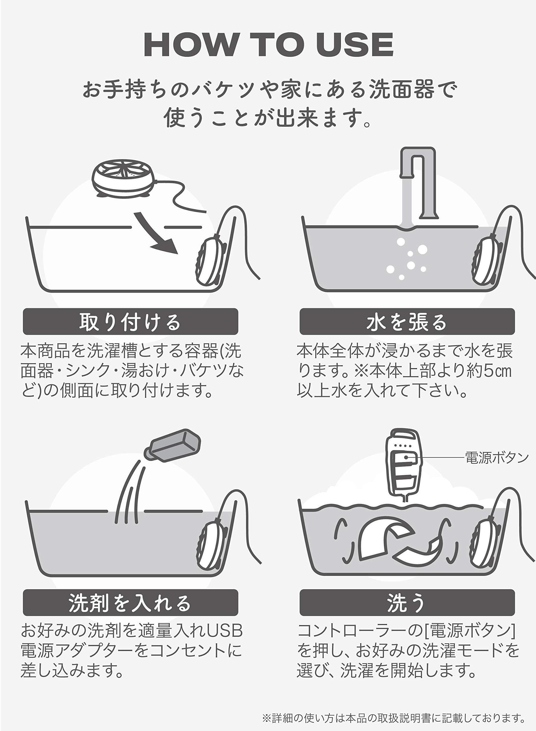 ●洗面台やウォッシュタブなどに本体を取り付け、水を溜めて、洗濯時間をセットするだけで簡単に分け洗いができます