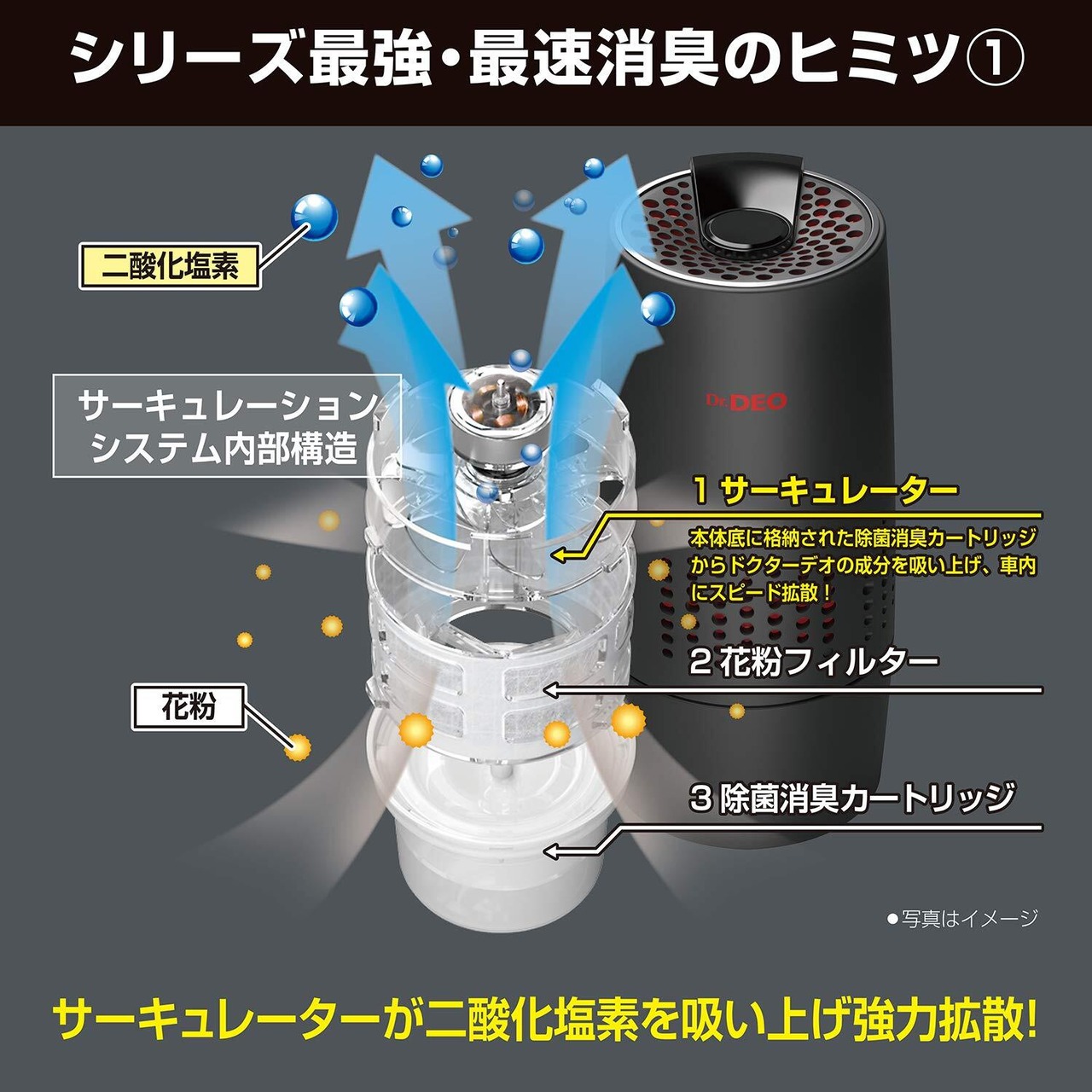 除菌消臭成分を車内隅々までスピード拡散。除菌消臭カートリッジから二酸化塩素ガスが発生。サーキュレーターから発生した風により車内にスピード拡散します。二酸化塩素ガスが空間に浮遊する菌・ウイルスを強力除去し、さらに悪臭分子を酸化分解します。