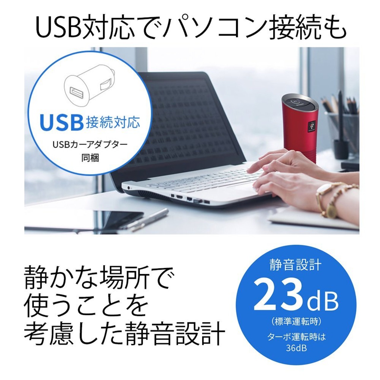 カップホルダーに置いて車内に付着したニオイを消臭。消臭スピード2倍のターボ運転搭載。花粉キャッチフィルターで細かなホコリも捕集