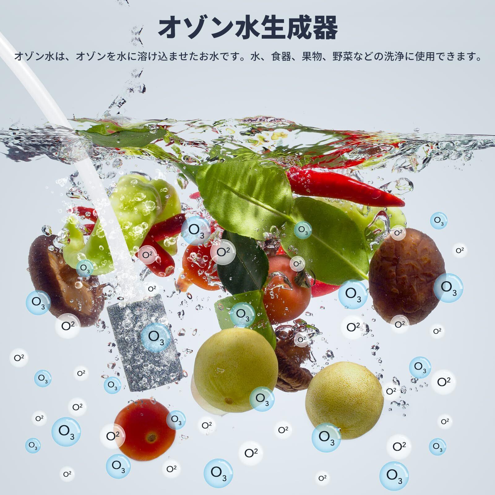 【オゾン水発生器】オゾン水は水、食器や果物や野菜などの洗浄に利用し、殺虫剤、肥料など有害物質を分解して除菌します。また、魚介類や肉類などの洗浄にも使用でき、臭いを取り除き、表面のバクテリアを除去し、保存期間を延長する。また、食器の洗浄やテーブルの拭き掃除にも使用できます。