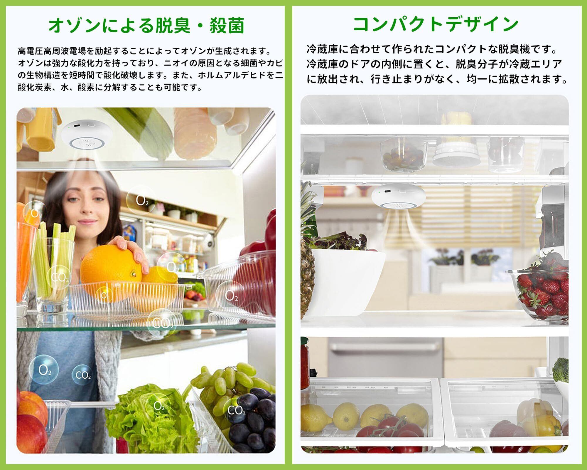 【一台四役の冷蔵庫用多機能脱臭機】この冷蔵庫脱臭機は伝統的な脱臭炭配合の冷蔵庫用脱臭機の違い、フィルター交換にも必要なく、低濃度オゾン発生器による高効率消臭、臭いの問題を根本から解決します。脱臭・殺菌・鮮度保持・残留農薬分解の四つの機能を揃えています。