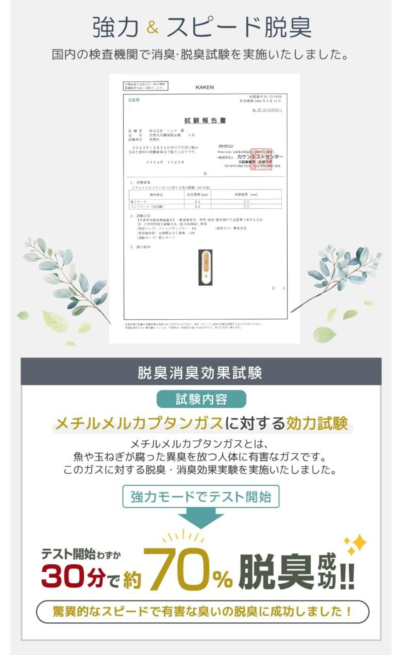 強力&スピード脱臭。国内の検査機関で消臭・脱臭試験を実施いたしました。 KAKEN 試驗報告書 脱臭消臭効果試験 試験内容 メチルメルカプタンガスに対する効力試験 メチルメルカプタンガスとは、 魚や玉ねぎが腐った異臭を放つ人体に有害なガスです。 このガスに対する脱臭・消臭効果実験を実施いたしました。 強力モードでテスト開始 30分で約70%脱臭!! 驚異的なスピードで有害な臭いの脱臭に成功しました!