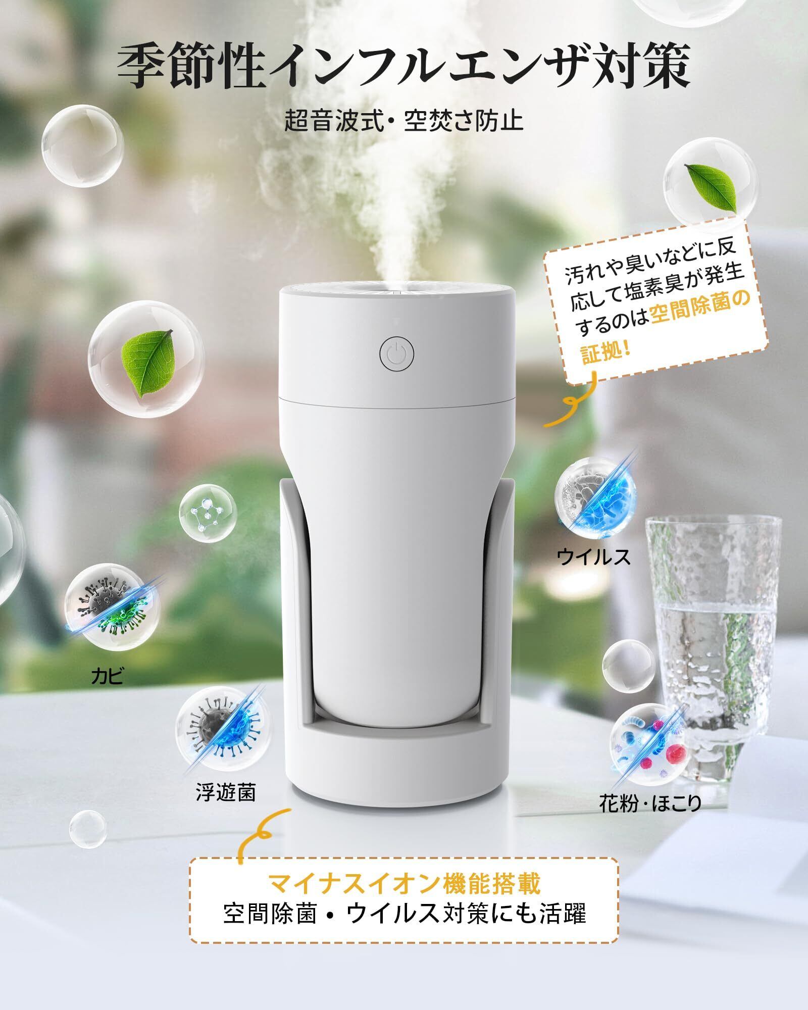 【静音設計&次亜塩素酸水対応】この車 加湿器は静音設計が施されており、就寝中や仕事中でも気になることなく使用できます。この小型加湿器は、エアフレッシュニング機能も兼ね備えており、空気中の不純物を取り除き、より清潔で健康的な空間を提供します。卓上加湿器は次亜塩素酸水にも対応しており、除菌効果を高めることができます。お部屋の空気を清潔に保ちながら、快適な湿度を維持します、安心してご使用いただけます。
