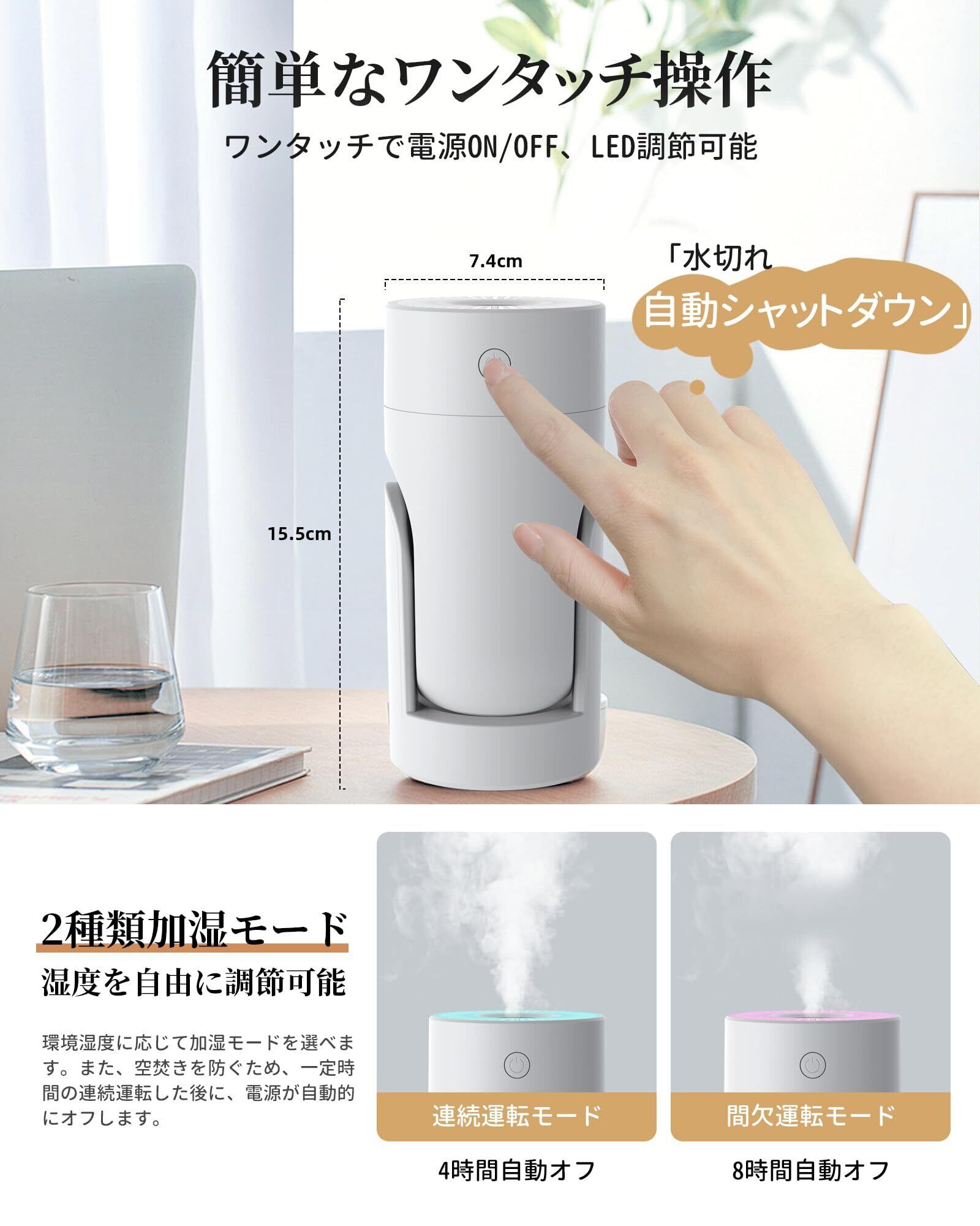 【Type-C給電式加湿器&1日間連続使用】この超音波式加湿器はType-C給電式を採用しており、アダプターだけでなく、パソコンやモバイルバッテリーからも電源がとれるからどこでも使いやすいです。さらに、充電で作動する加湿器(運転時間が2、3時間だけなのに充電時間はそれ以上、電源を繋ぎっぱなしに使用するのも過充電が気になります)とは違い、電源で使用するこの加湿器は過充電にならず安全です。また、大容量のモバイルバッテリーとの併用も非常に便利で、使用時間を24時間大幅に延長することができます。持ち運び車用加湿器として、旅行、車用、寝室、オフィスなどに最適です。
