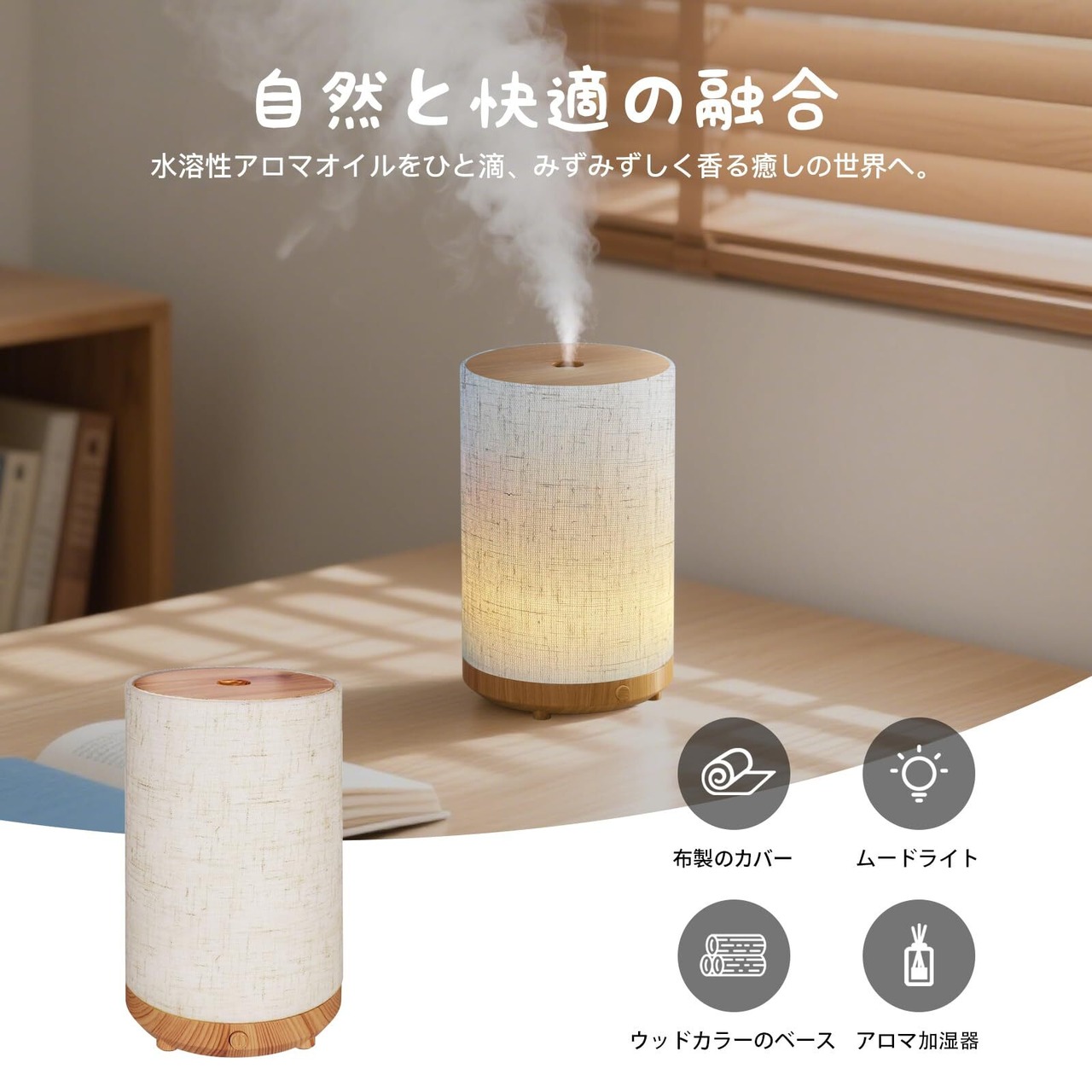 加湿器 新モデル アロマディフューザー 小型 除菌 超音波式 卓上型 省エネ 静音 空焚き防止 LED暖白ライト お手入れ簡単 寝室・部屋・オフィス用 乾燥対策 ギフトにも最適 (布調デザイン)