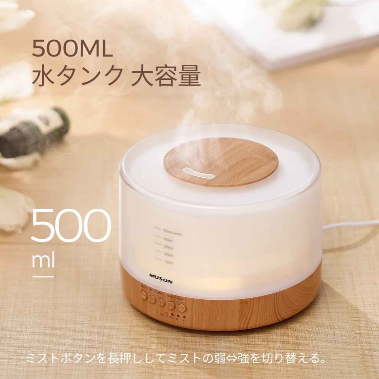MUSON(ムソン) 加湿器 卓上 超音波式 アロマディフューザー 500ML アロマ対応 花粉対策 静音 タイマー 大容量 上から給水 ナイトライト 間接照明 明るさ調整可 音楽内蔵 空焚き防止 お手入れ簡単 乾燥対策 おしゃれ 木目調 ホワイト 部屋/寝室/会社用