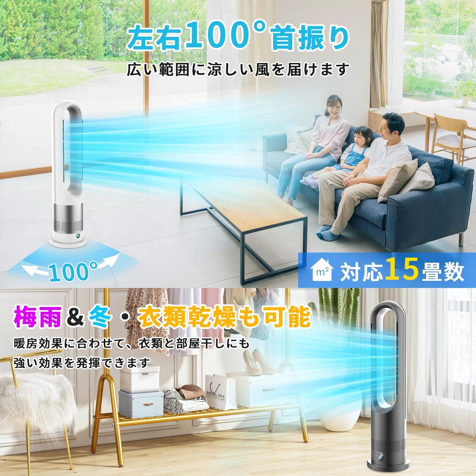 【2025新登場&冷暖兼用&DC電気節約】タワーファン 羽なし扇風機 冷暖両用 リビング扇風機 サーキュレーター DCモーター 静音運転 8段送風&3段温風 大風量 100°左右首振り 9時間切タイマー 省エネ 節電対策 お手入れ簡単 省スペース 組み立て不要 安全機能搭載 リモコン付 部屋 リビング 会議室 室内など対応 PSE認証済 日本語説明書