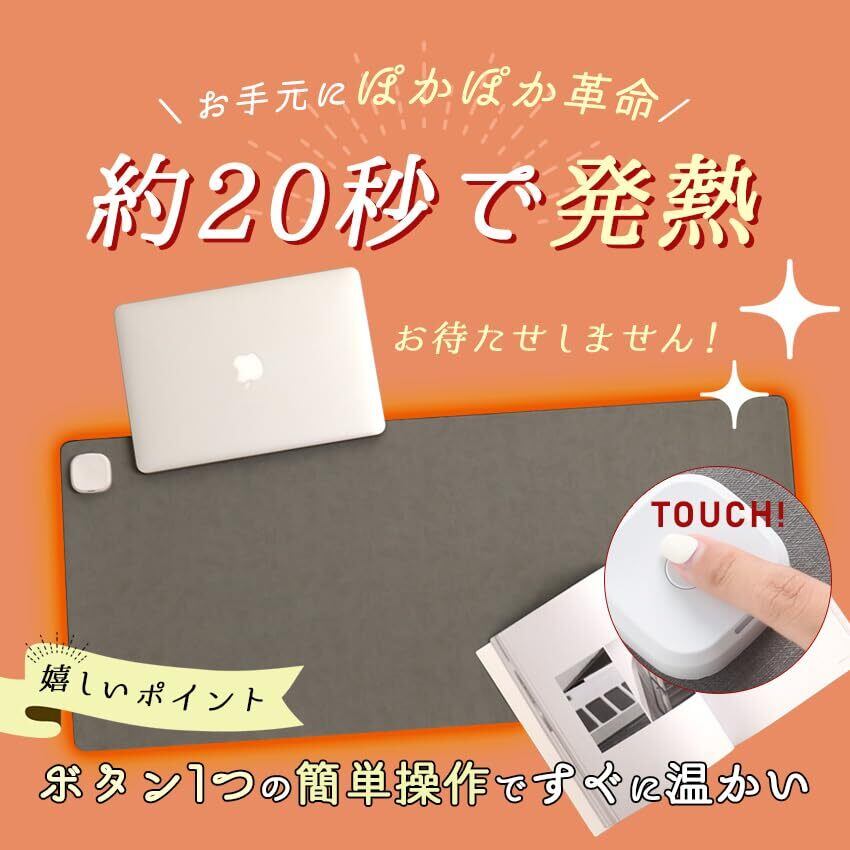【オススメポイント】ありそうでなかった!?寒い季節に冷えを感じやすいお手元まわりをぽかぽか環境に。発熱するデスクマットで心地よい温かさをお届けします。スイッチを押して20秒で発熱。作業開始時にパソコンのスイッチと同時に押せば、快適温度で作業もスタート!温度は3段階で季節や環境に合わせて選ぶことが可能です。消し忘れても安心な4時間自動OFF機能搭載。うっかりドリンクをこぼしてもサッと拭き取れる撥水性の素材を使用したニクい仕事をしております。柄も沢山ご用意させていただきました。お過ごしの作業環境に合わせてお選び下さい。プレゼントにもぴったりな商品。今年の冬はデスクマットヒーターがあれば心も身体もぽかぽかです!