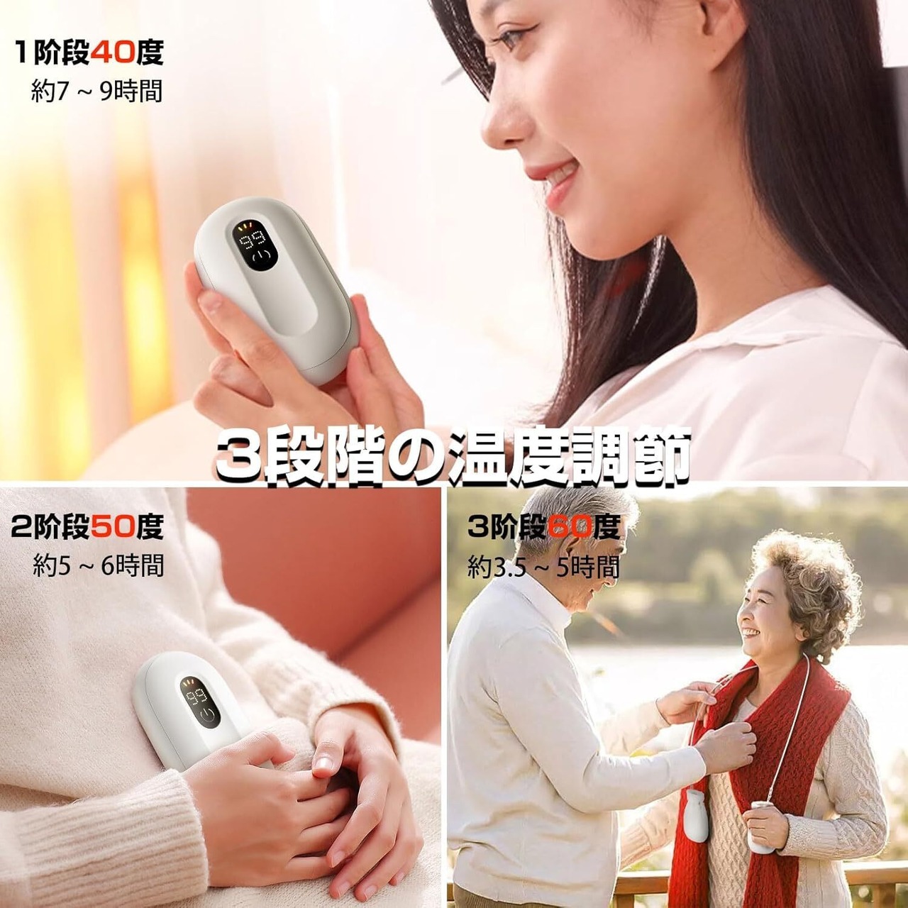 【3段階の温度調節——さまざまなシーンに適応】充電式電気カイロは、3つの温度設定を備えています。1段階では40℃で、室内での活動や子供の宿題、パソコン作業時に手を暖かく保つのに最適です。2段階の50℃と3段階の60℃は、屋外作業やアクティビティにぴったり。寒い冬の日、この電気カイロは家族や友人への贈り物としても最良の選択です。