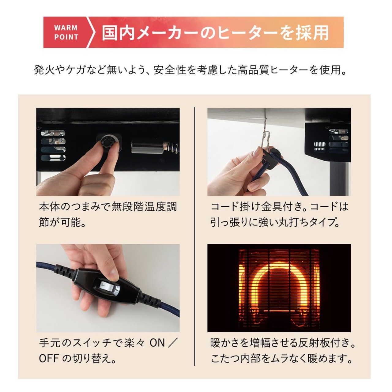 No.1シェアを誇る安心の国内メーカー(生産は海外)の高品質ヒーターを採用。発火やケガなどが無いように、安全性を考慮した機能が詰まっています。 一般的なこたつ用のヒーターの電気代は、エアコンの約3/1以下!こたつは、家計にも環境にもやさしいエコな暖房器具です。