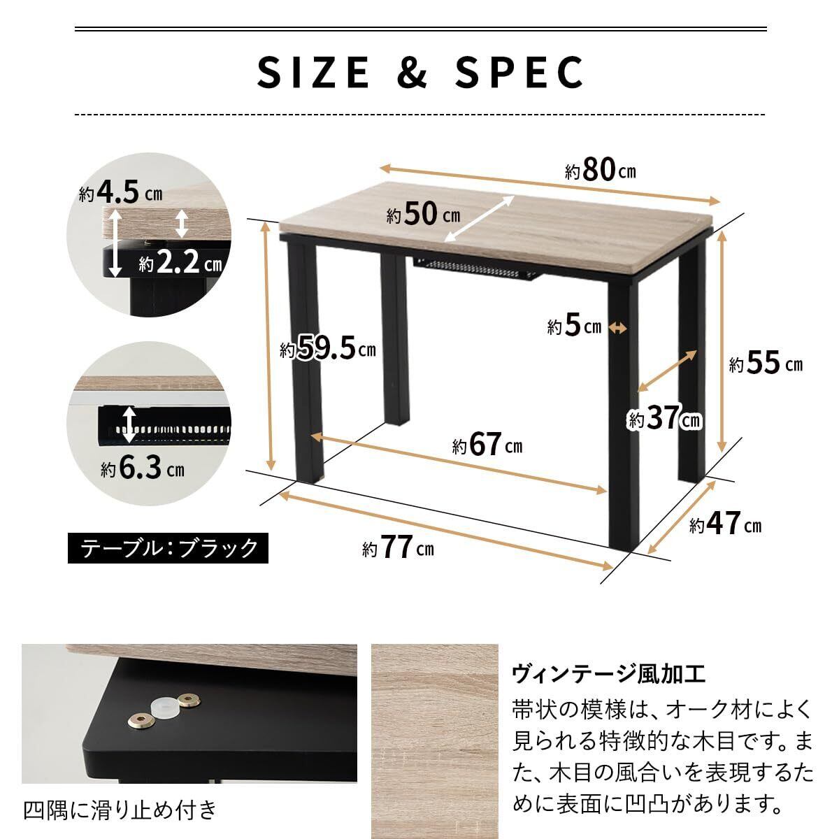 ■こたつテーブル■【サイズ】約幅80×奥行50×高さ59.5cm ※一人暮らしでも使いやすく、さらにコンパクトにリニューアル! 【組成】天板・脚:合成樹脂化粧繊維板/ヒーター:メトロ電気工業製 MS-303H(K) 300W/発熱体:U字型 石英管ヒーター/温度調節:温調ツマミ無段階可変式/安全装置:温度ヒューズ・電流ヒューズ/電源コード:丸打ちコードタイプ・電源スイッチ付き 【カラー(天板)】ヴィンテージ ※帯状の模様は、オーク材によく見らる特徴的な木目であり、傷ではございません。あらかじめご了承ください。 【商品重量】約13.5kg 【耐荷重】約20kg