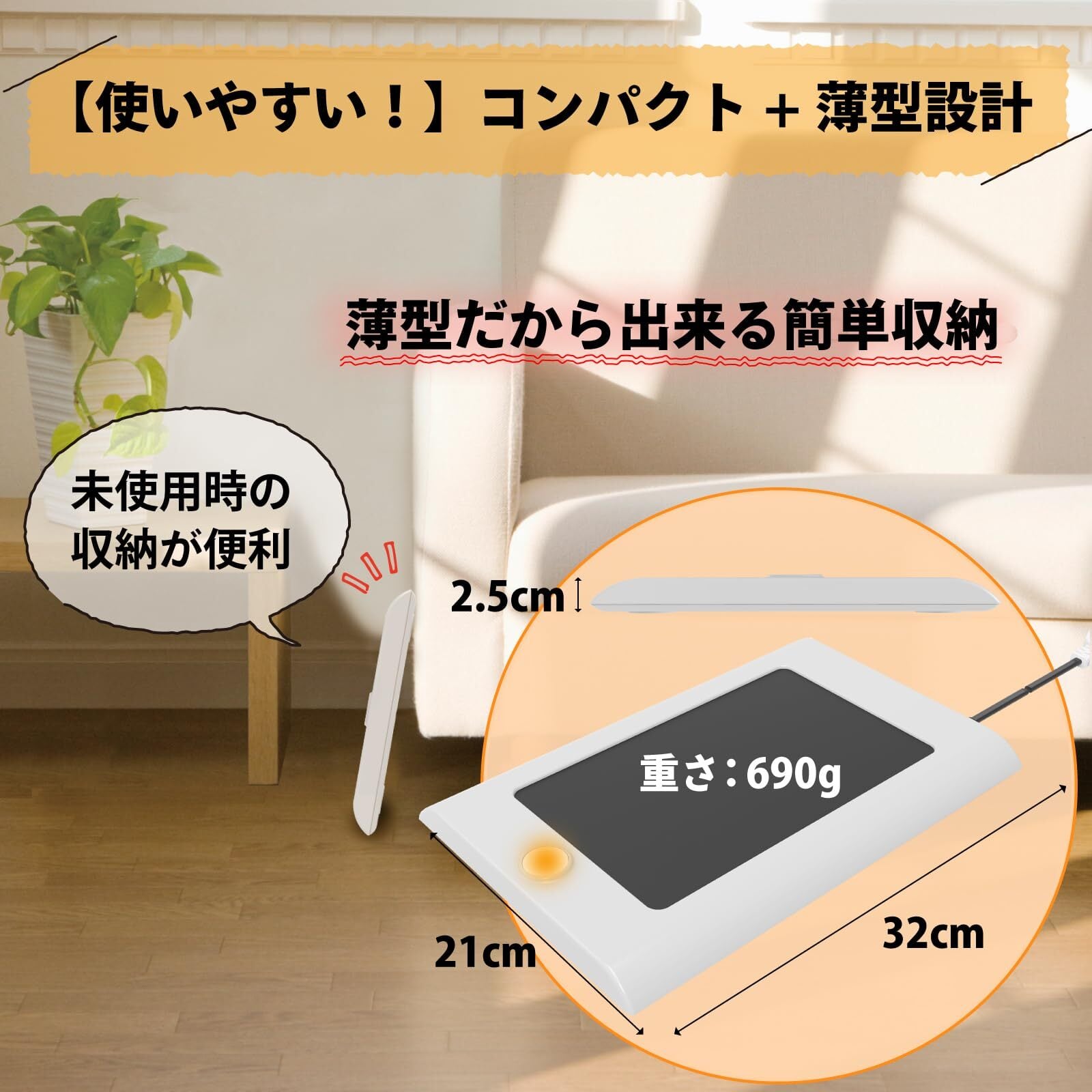 【商品仕様】▪本体サイズ:幅32×高さ21×厚さ2.5cm ▪ヒーター面サイズ:23×14cm ▪重量:690g ▪耐荷重:約30kg(製品の上に立って乗った状態でのご使用はできません) ▪電源:AC100V ▪消費電力:最大28W ▪温度調節:3段階(弱=約30度/中=約38度/強=約45度) ▪タイマー:3時間オートオフタイマー
