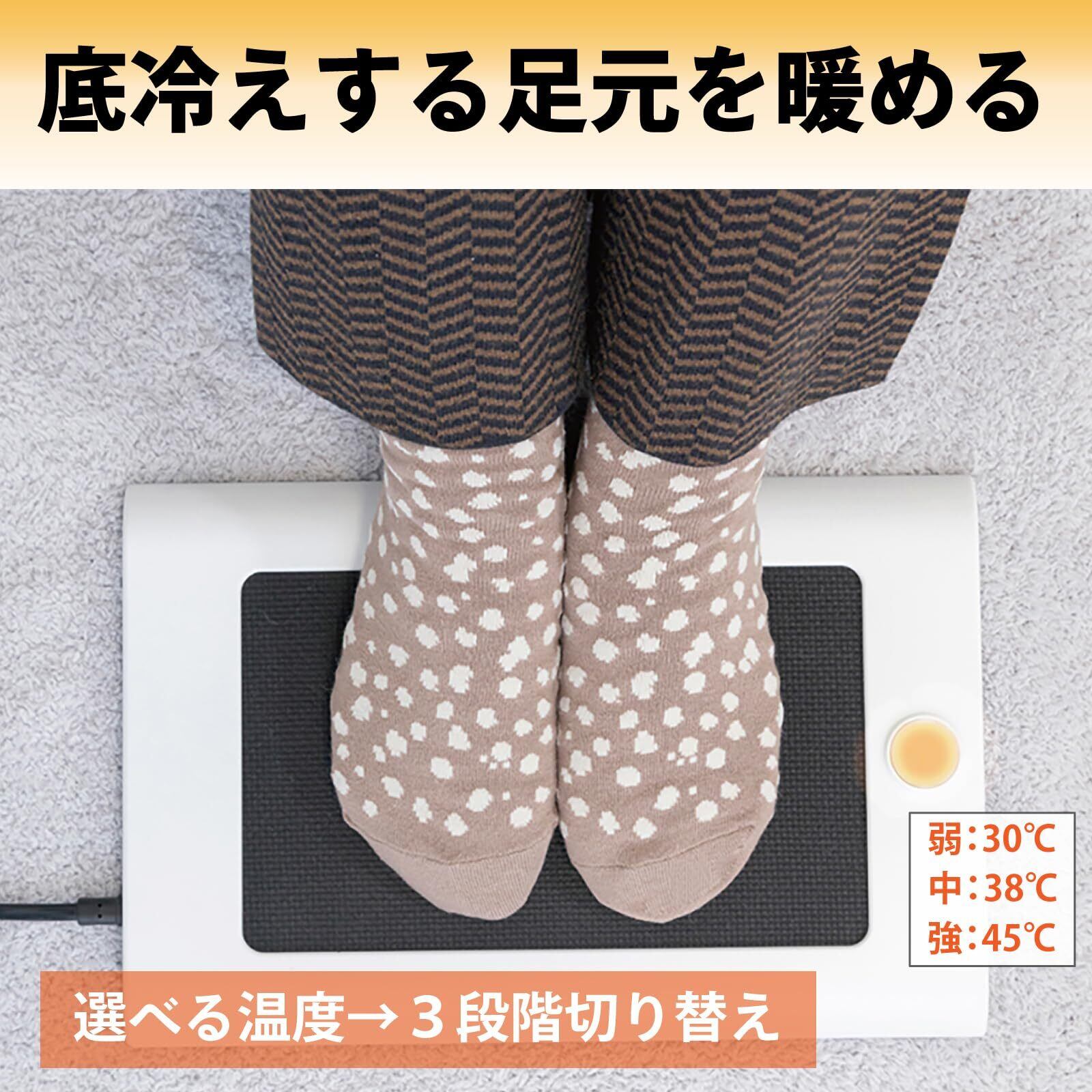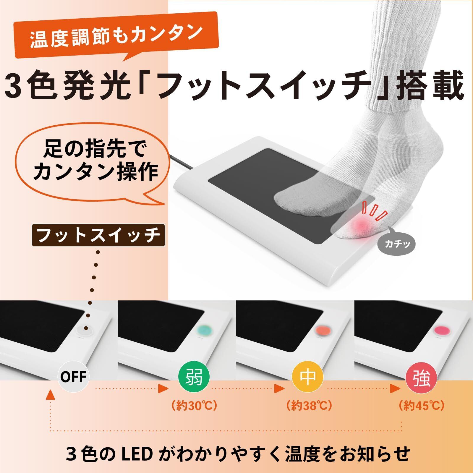 【足先で簡単操作】足の指先で簡単に操作できるフットスイッチを搭載。お好みに合わせて3段階の温度調節ができ、3色のLEDが分かりやすく設定温度をお知らせします。